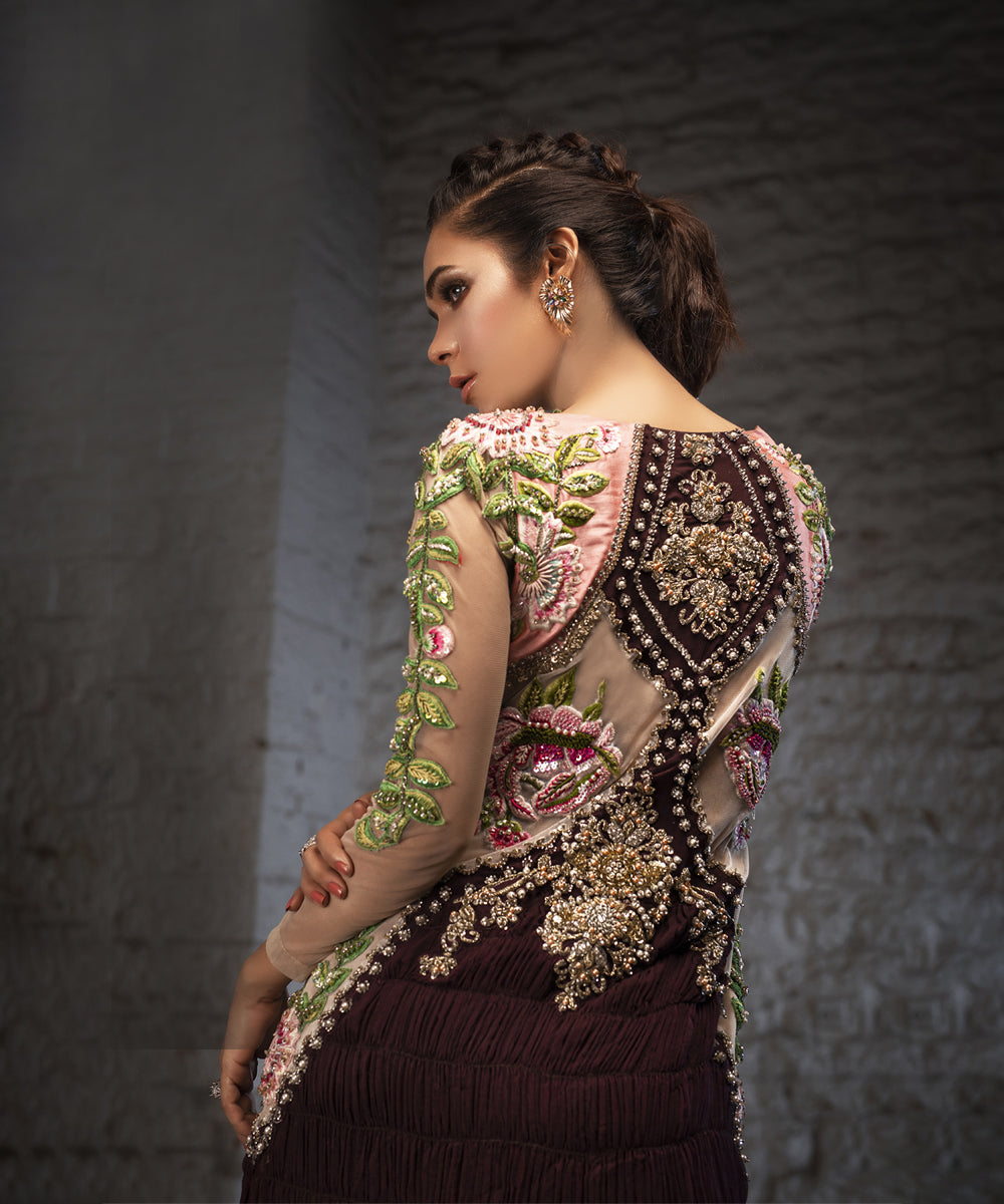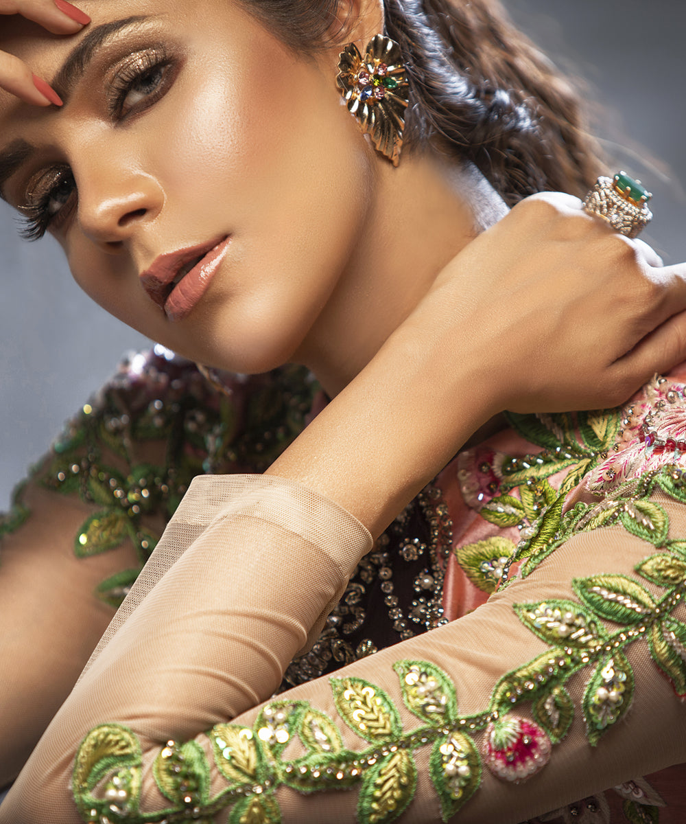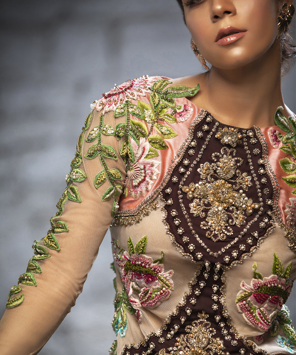 - Embroidered leaves appliqued sleeves