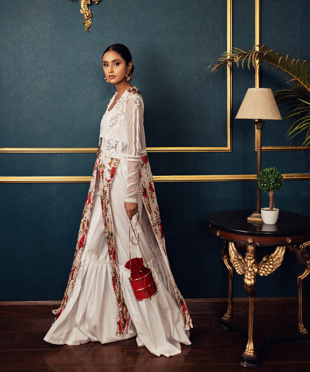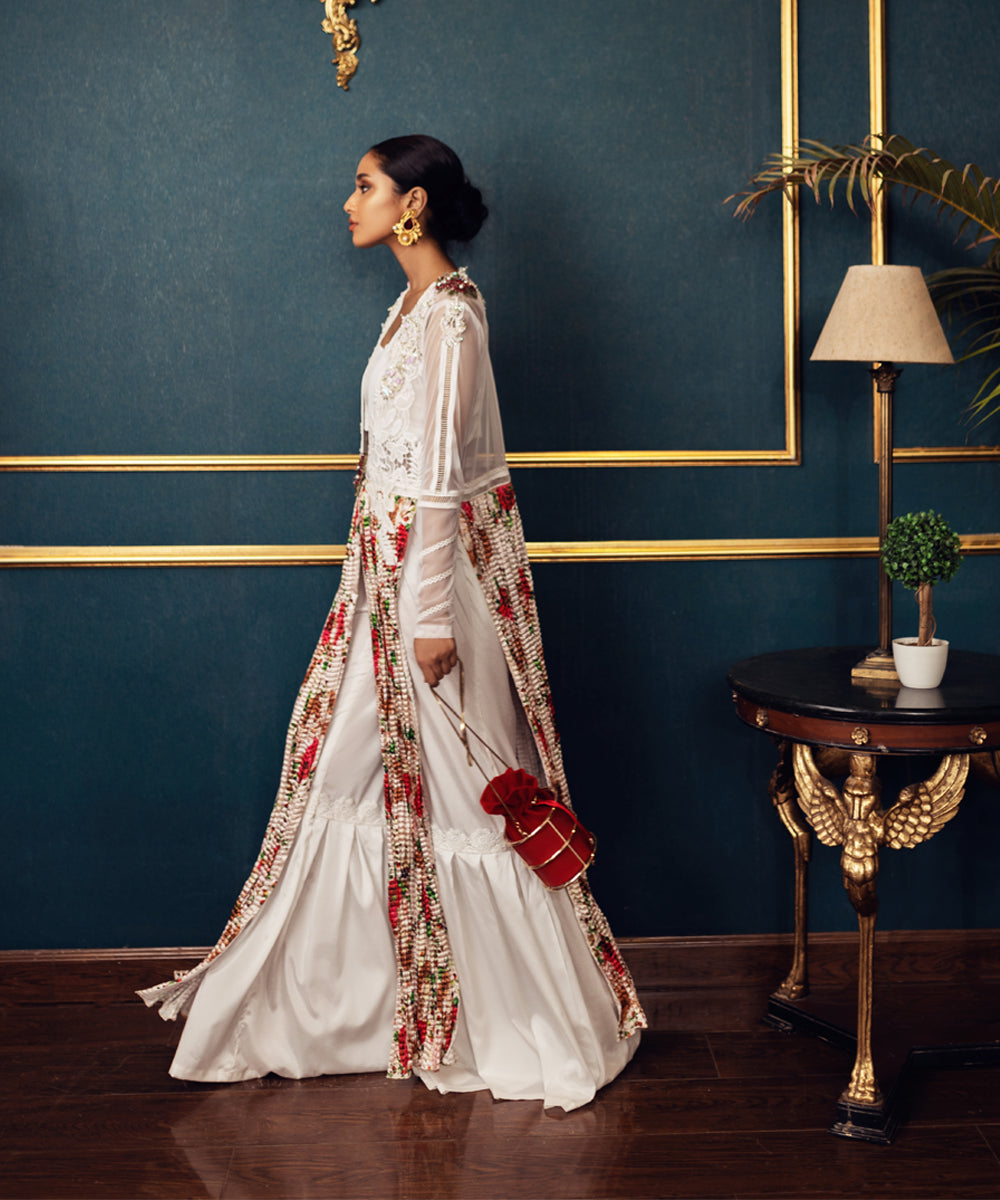 Indulge in elegance with a front-open crushed gown, featuring a lace bodice and printed crushed front panels. The gown is adorned with a heavy hand-embroidered motif for a touch of opulence. Pair it with gharara pants and a matching blouse for a sophisticated and timeless ensemble.