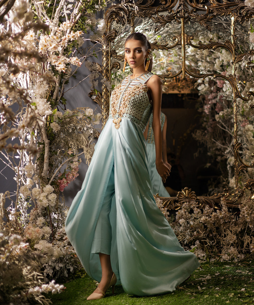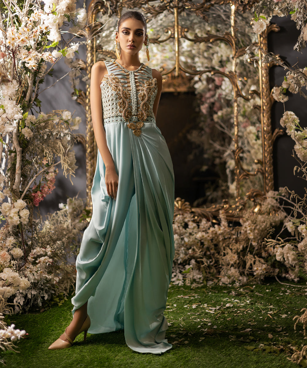 Embrace the allure of ancient Egypt in this silk draped gown with a captivating hand-knot dori work and Egyptian-inspired metal studs on the bodice. The gown's luxurious silk drapes elegantly to the floor, exuding timeless beauty