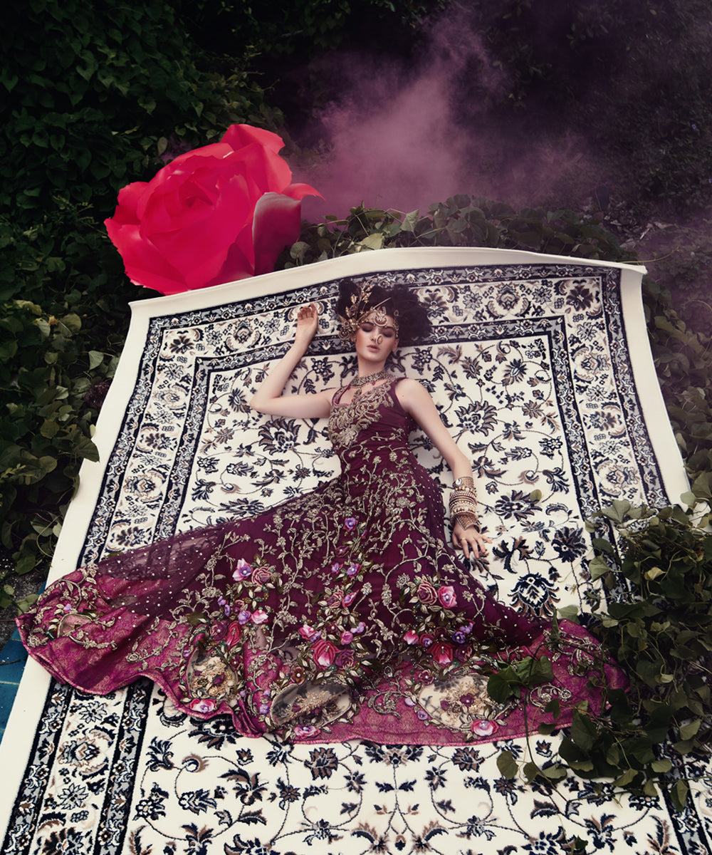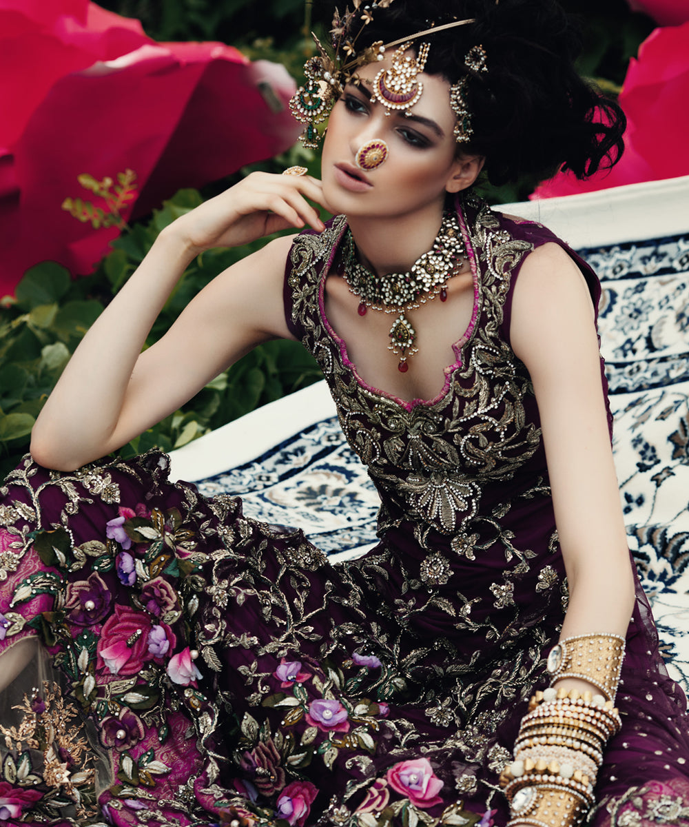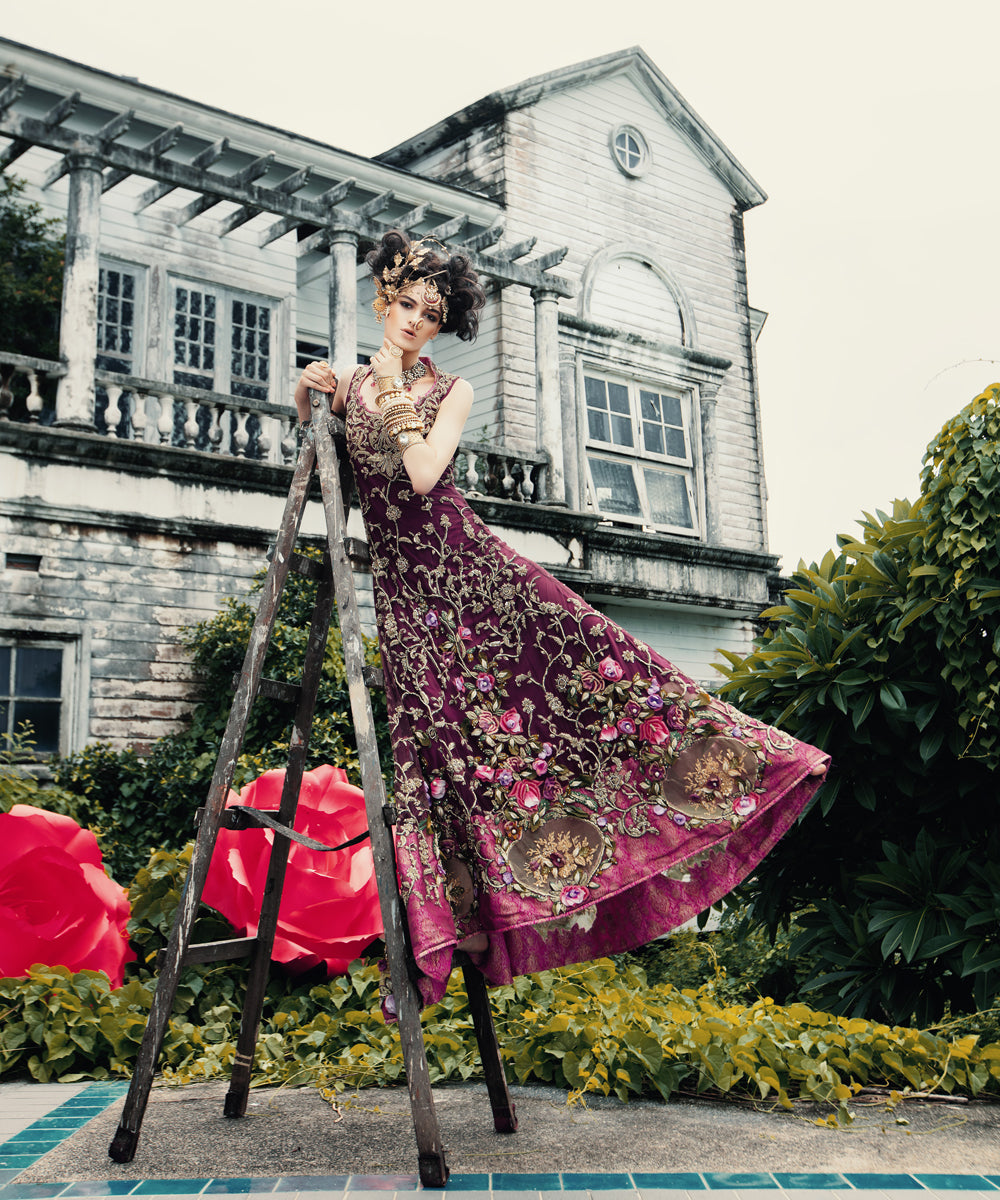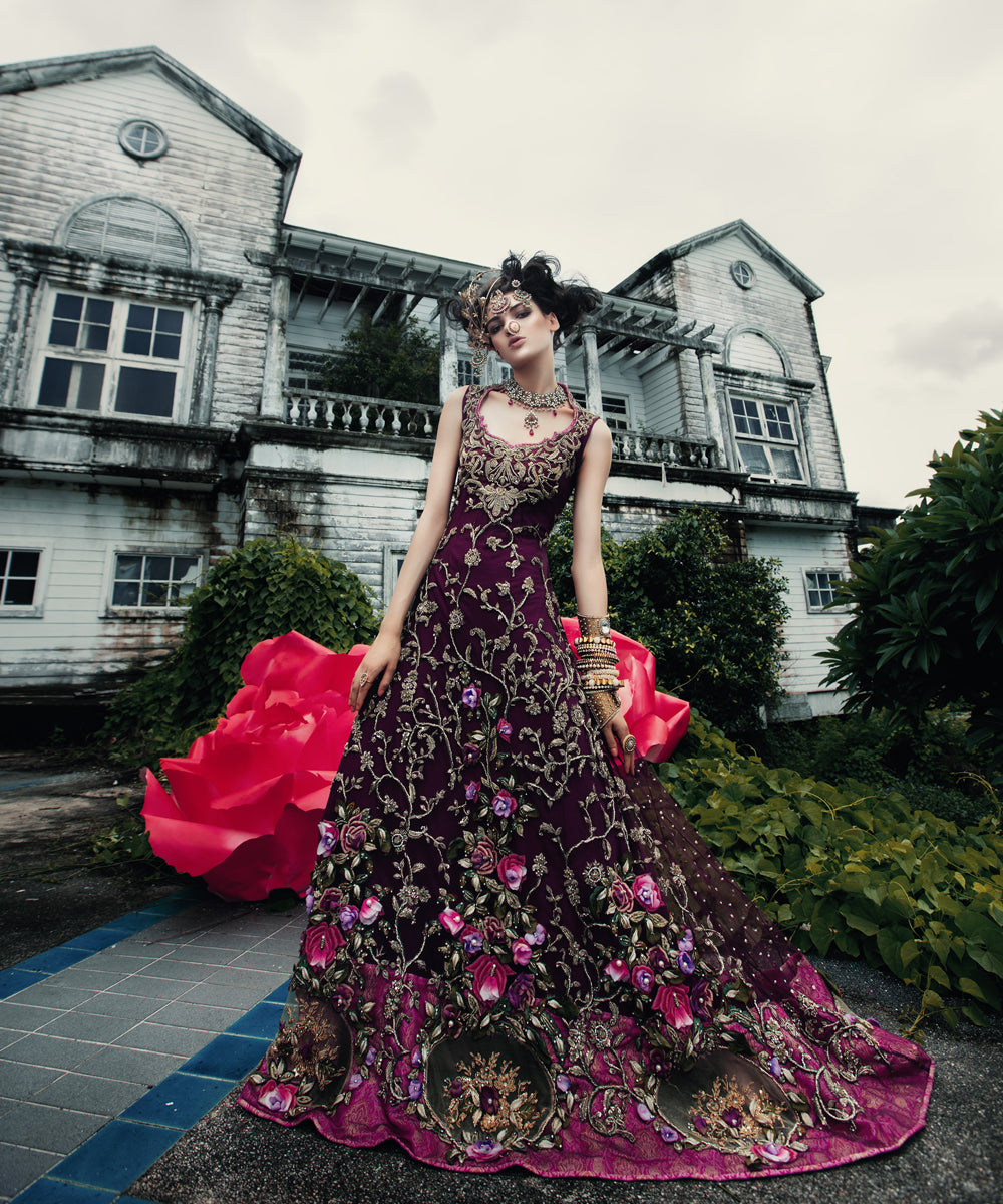 Enthralling aubergine gown with dull-gold zardozi hand embroidery smeared all over.Floral vintage formed motifs.3D Camellias scattered elegantly in border. Vintage look.