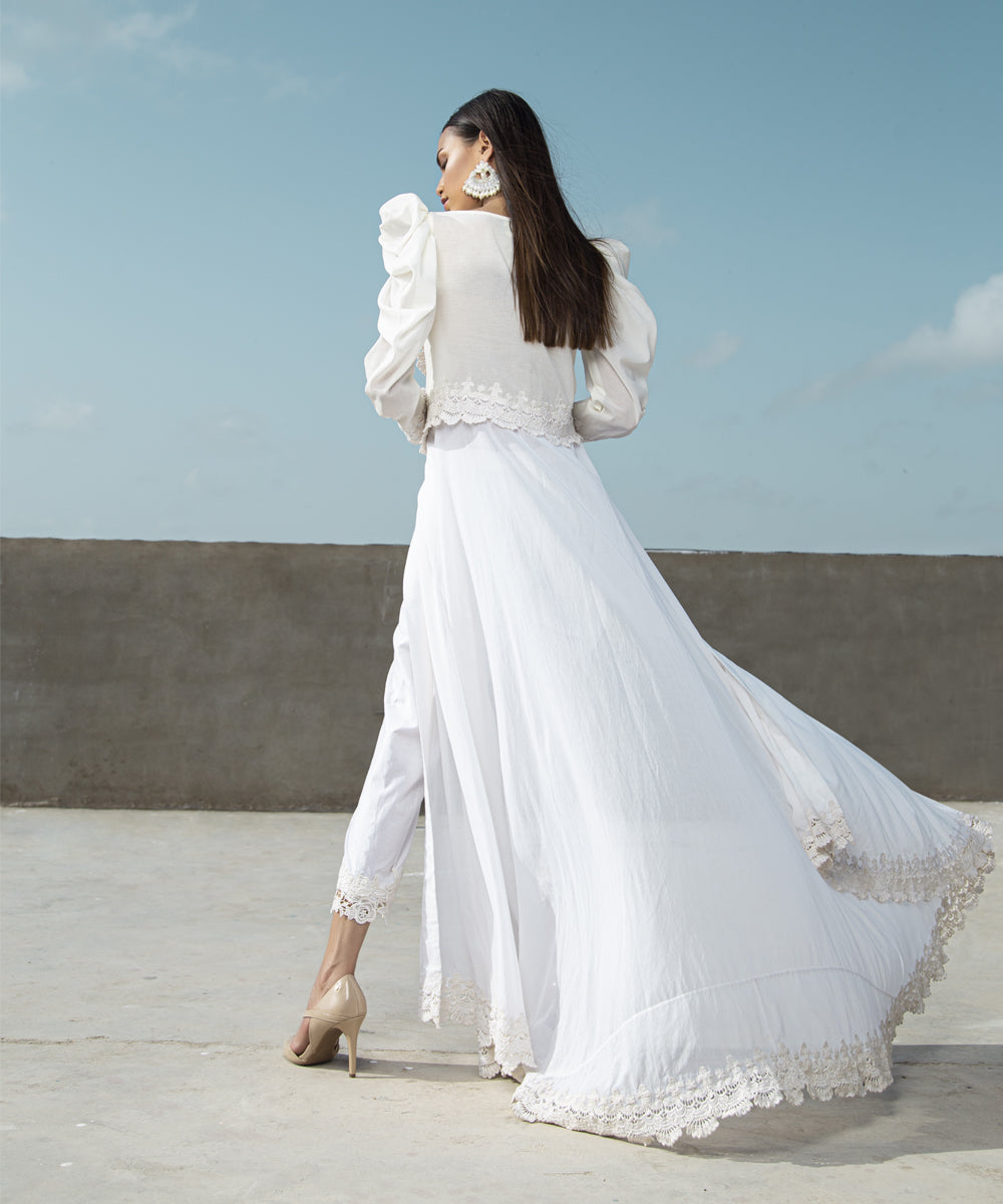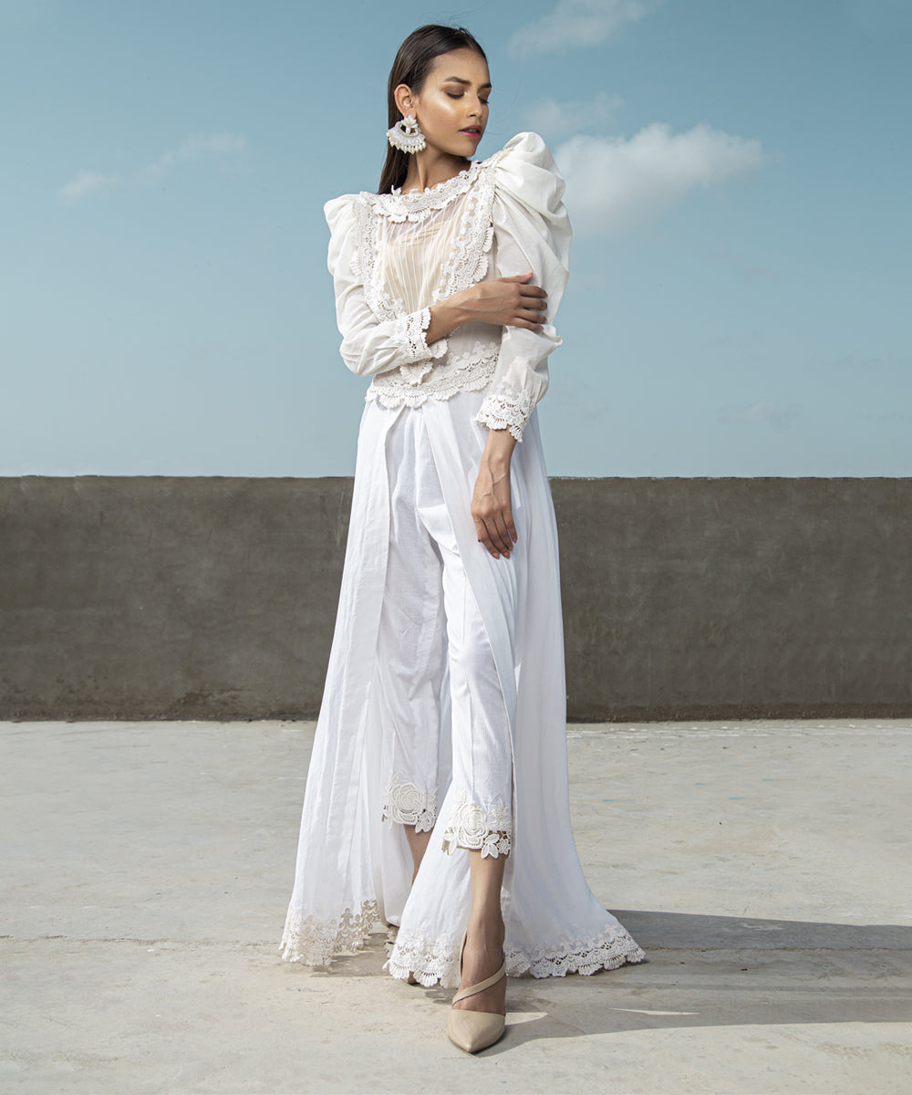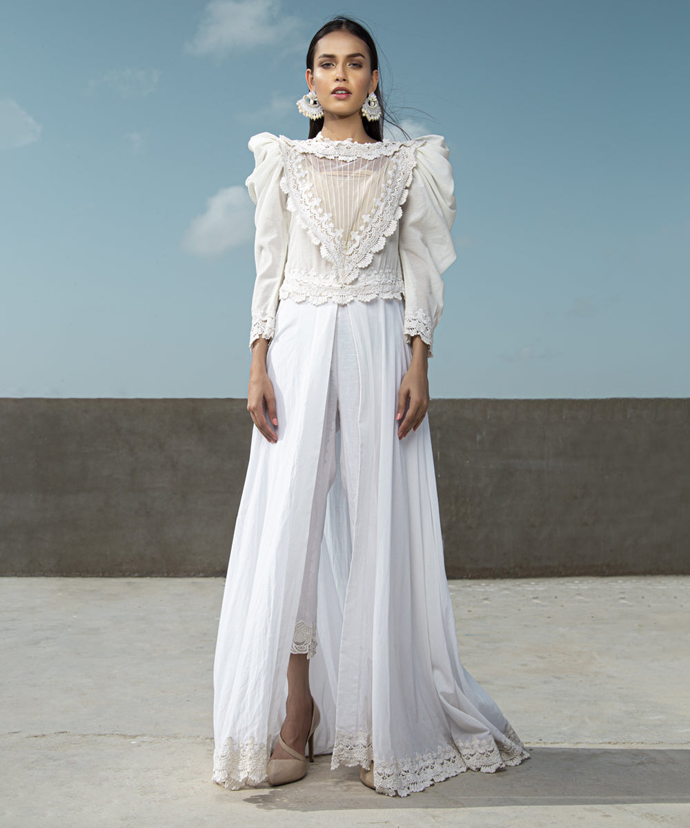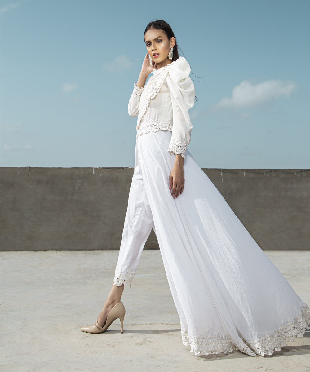 Lace apliqued front with puff shoulder gown with lace trimming at the bottom and pants