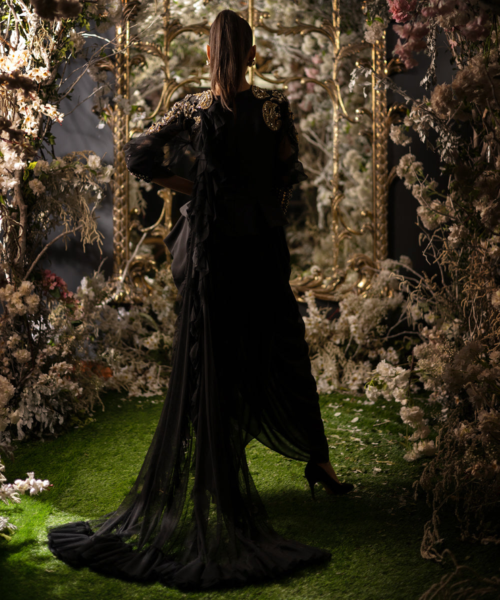 Indulge in the grandeur of a black, regal net peplum, heavily embellished with intricate gold work. This fusion ensemble features a chiffon georgette front-open saree draping elegantly. The net saree pallu is adorned with delicate tulle ruffle work, adding an exquisite touch, while the sleeves are a masterpiece of brass rivet weaving. Paired with silk pants, this outfit is a harmonious blend of tradition and modernity, making a bold and stylish statement.