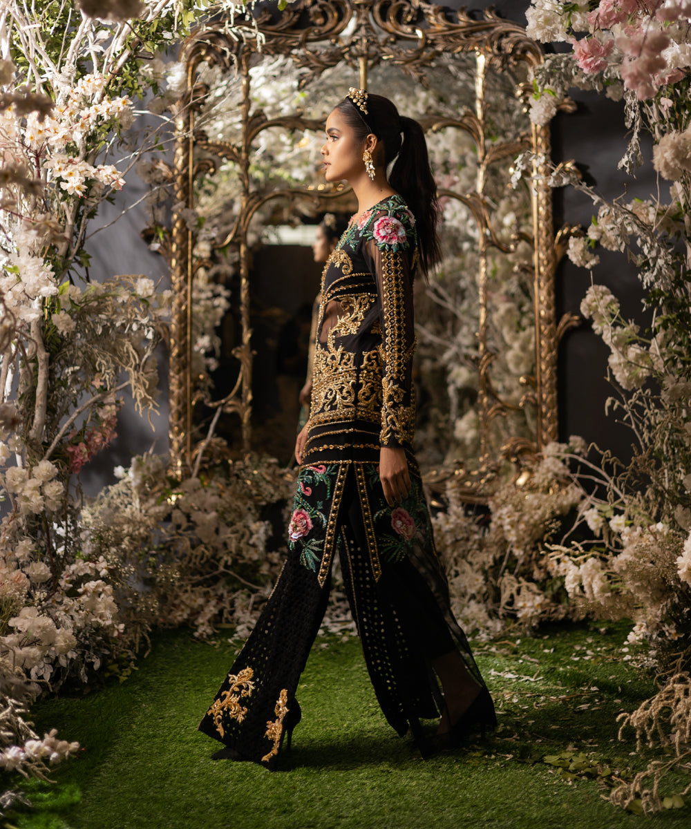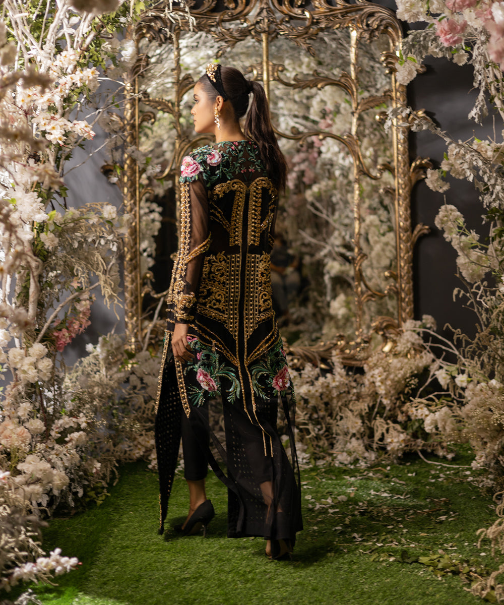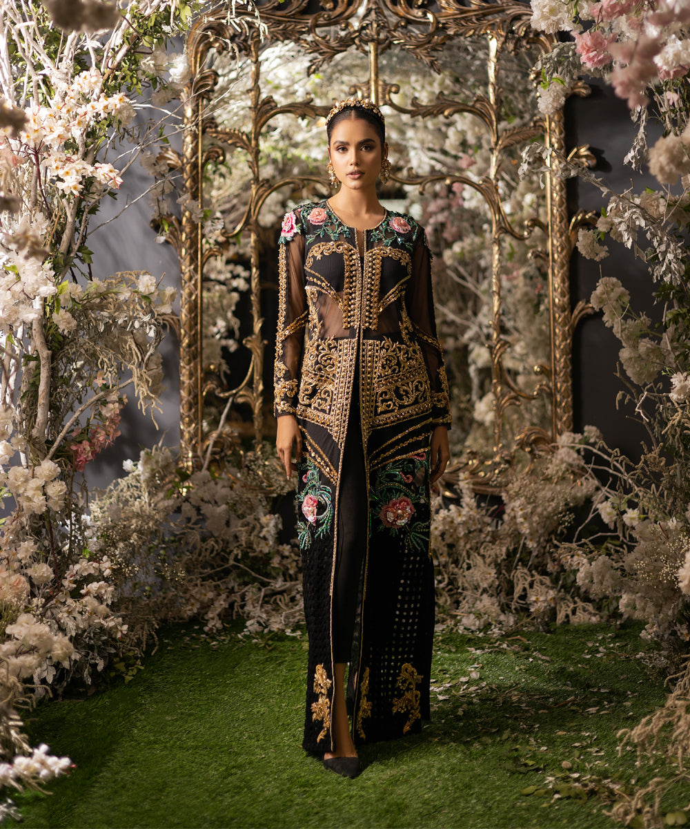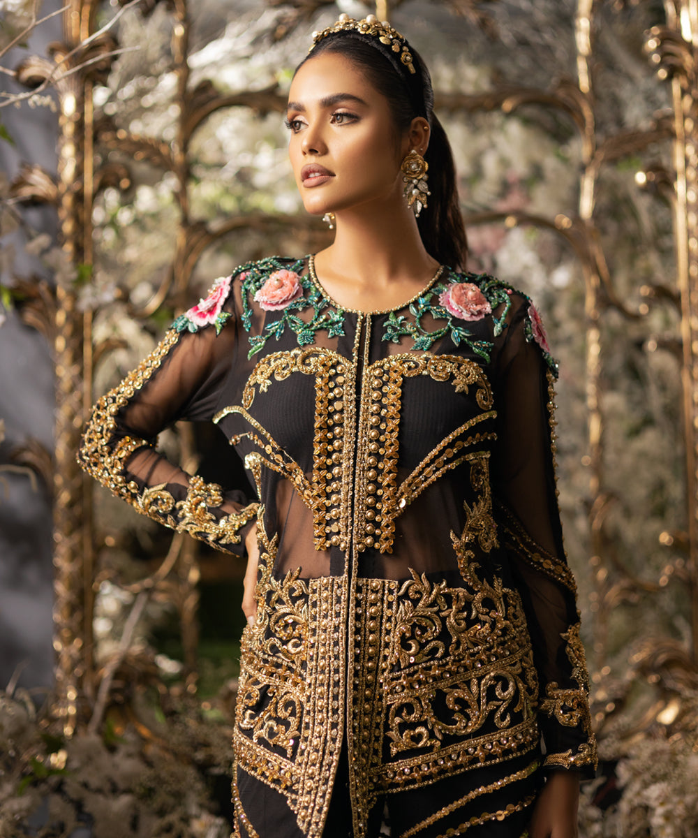 Indulge in Black Moroccan elegance with this regal jacket. Its intricate gold work adds opulence, while 3D floral details on the shoulders and hem exude luxury. The suede fabric's hand-weaving at the bottom elevates the design. Paired with silk pants, this ensemble is the epitome of refined style.