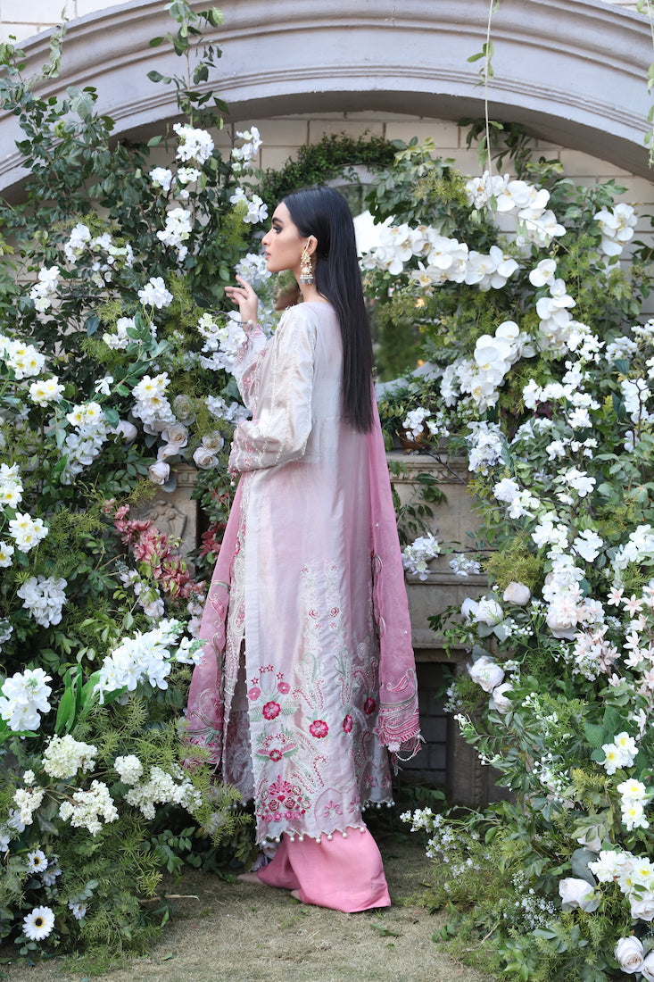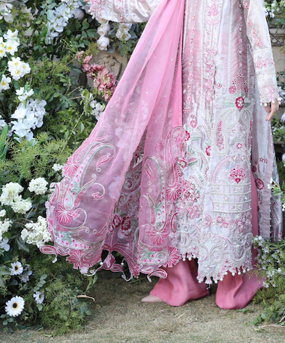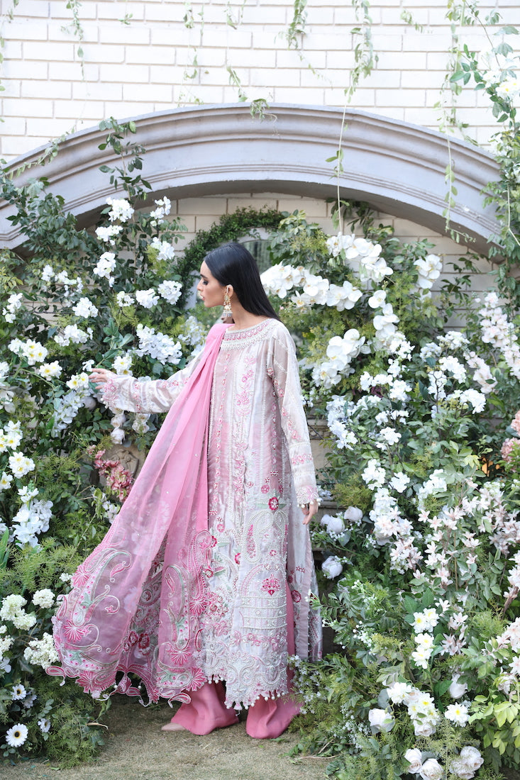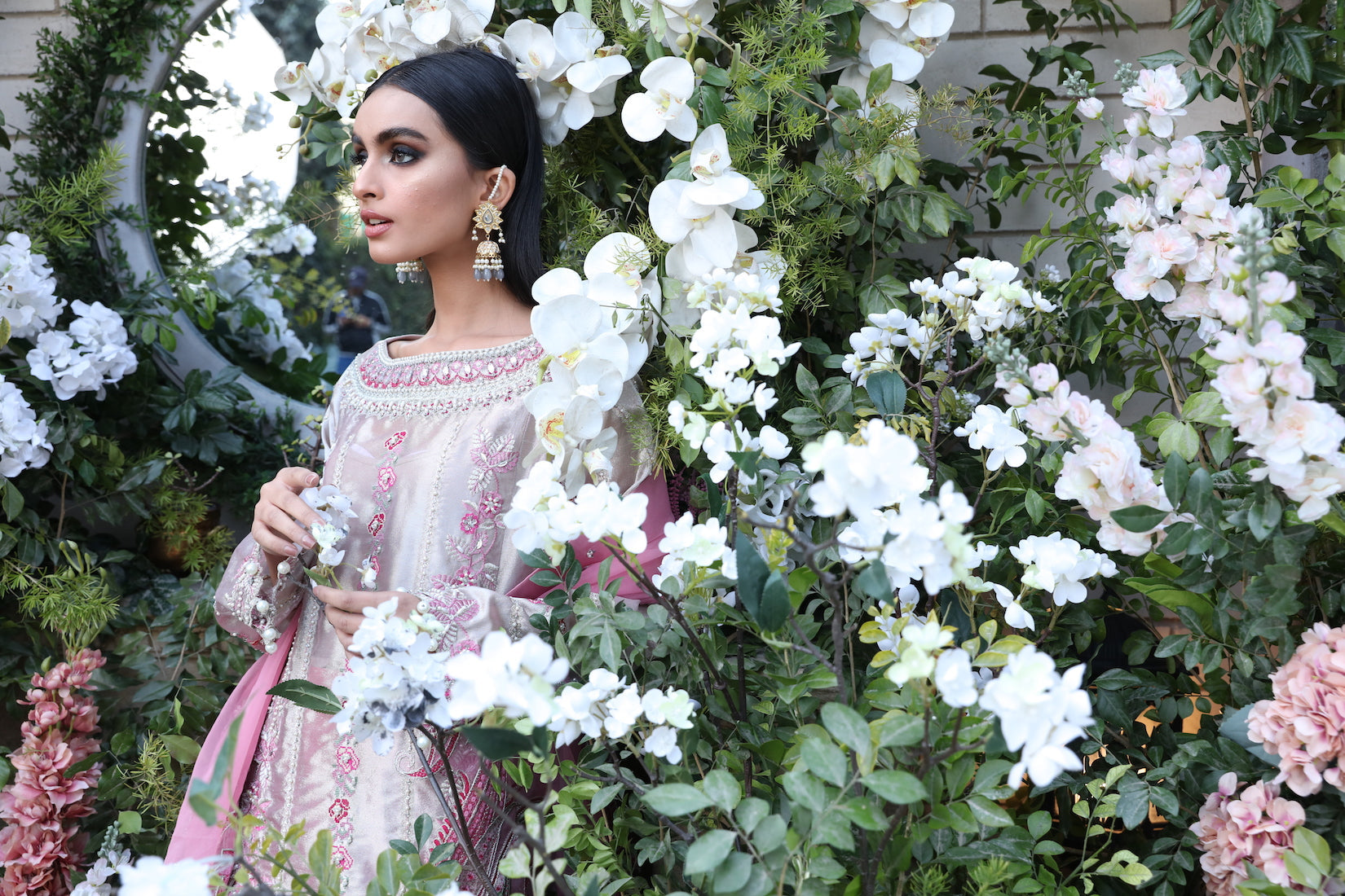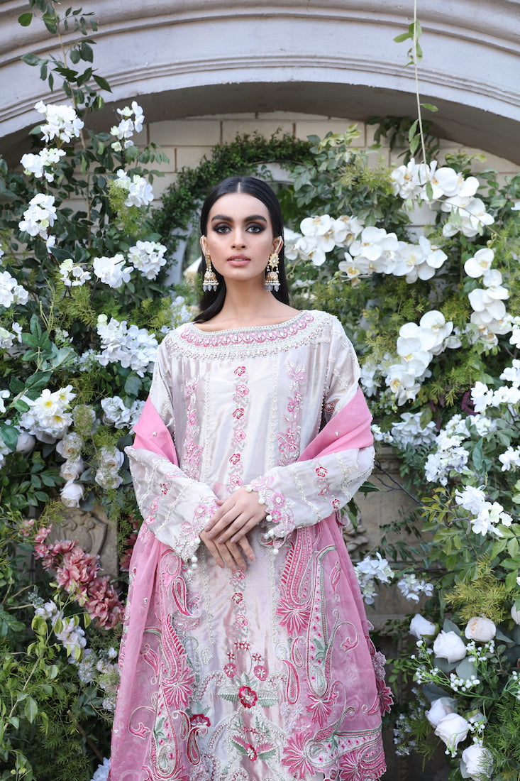 Three-piece blush pink outfit with neon pink embroidery creates a beautiful and feminine look. The combination of the embroidered shirt, plain pants, and organza embroidered dupatta with cut-work and embellished borders adds depth and visual interest to the outfit. It's a perfect choice for a special occasion or event.