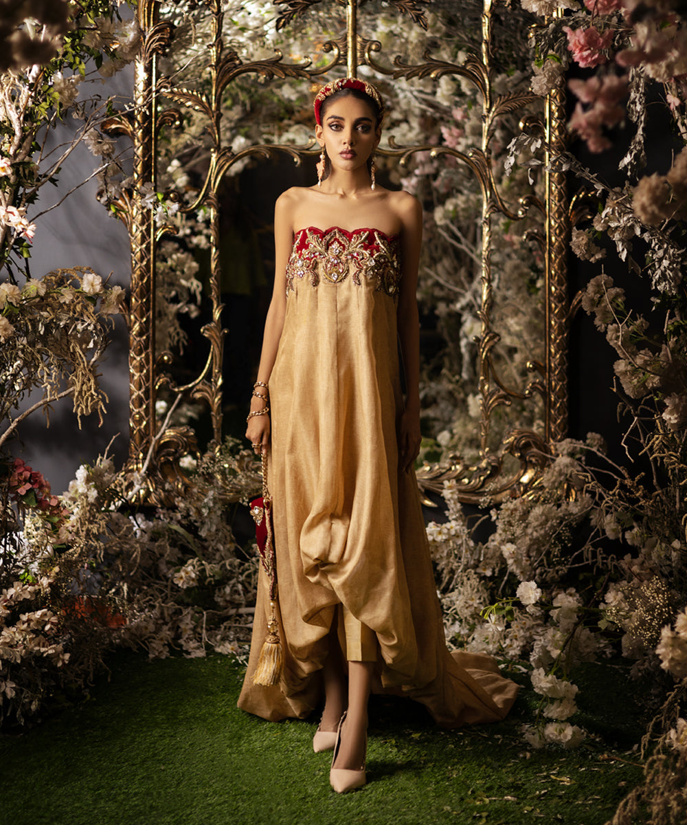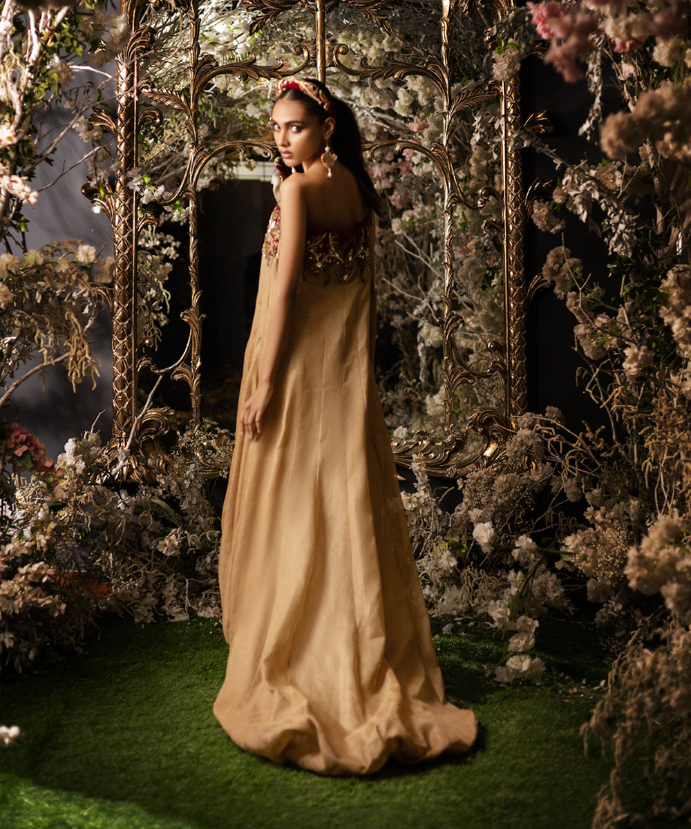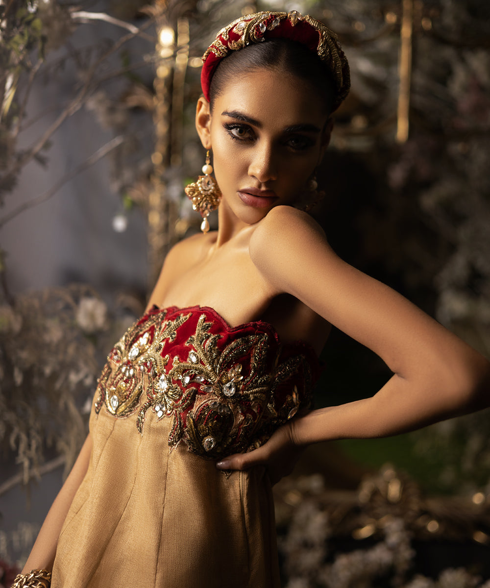 Indulge in pure elegance with our exquisite bubble-cut gown in shimmering gold loom fabric, featuring a graceful tail. The regal velvet off-shoulder appliqué adorned with majestic boroque-inspired heavy work exudes a true Maharani aura. Customizable with sleeves upon request, this gown is a statement piece for those seeking opulent style.