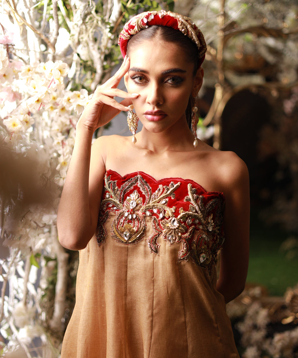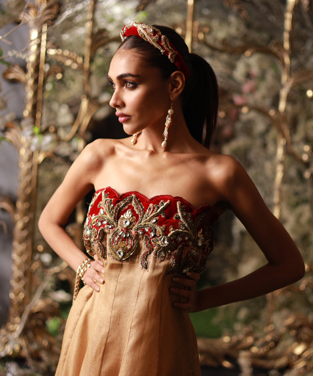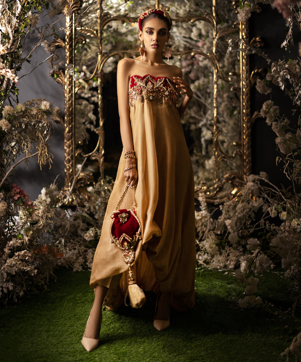 Indulge in pure elegance with our exquisite bubble-cut gown in shimmering gold loom fabric, featuring a graceful tail. The regal velvet off-shoulder appliqué adorned with majestic boroque-inspired heavy work exudes a true Maharani aura. Customizable with sleeves upon request, this gown is a statement piece for those seeking opulent style.