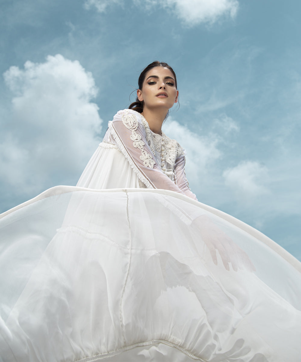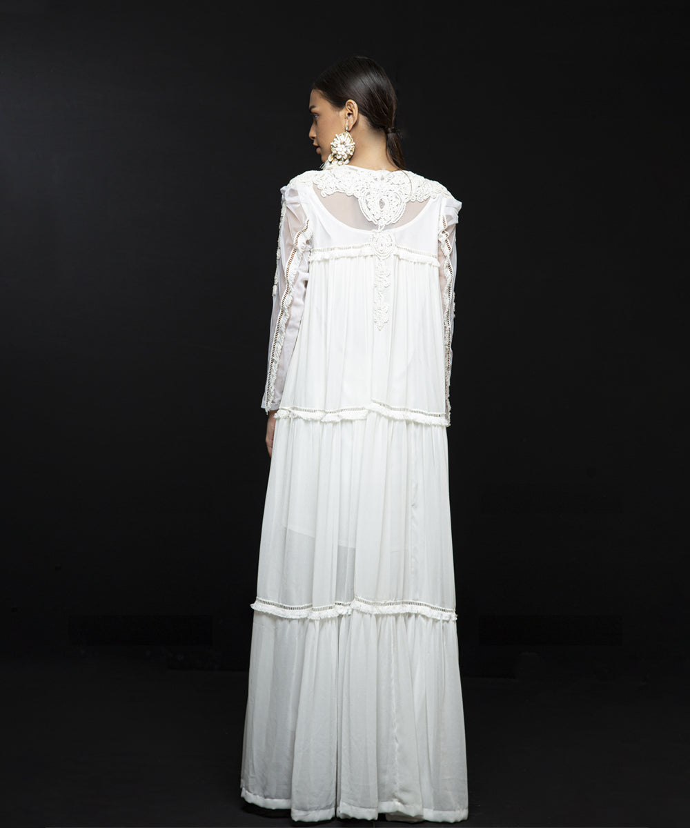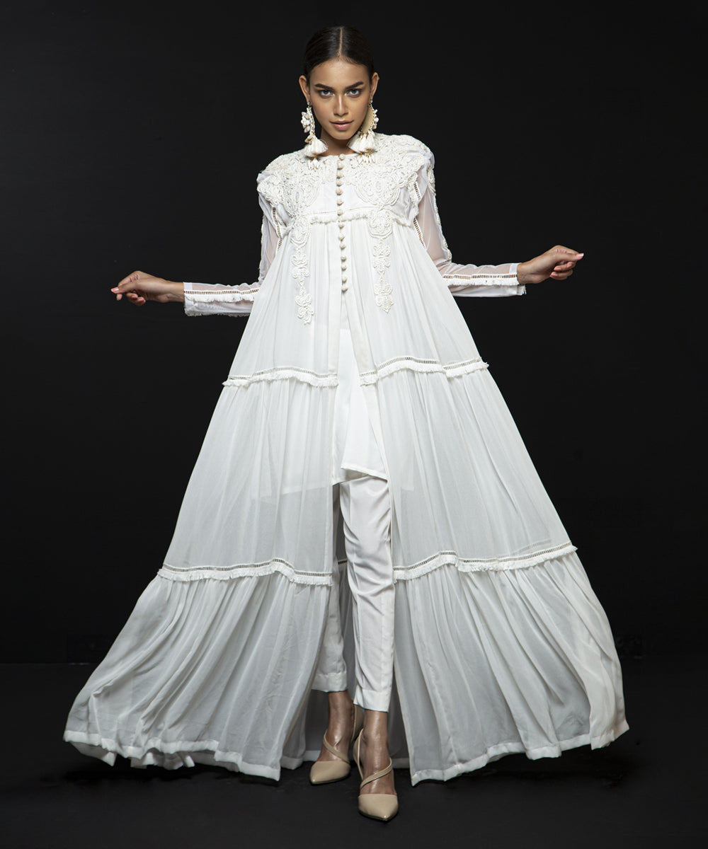 Inspired by Spanish crushed layers on the jacket. Rope handwork on the shoulders and sleeves. Laddewr lace and trimmings on the crushed layers.