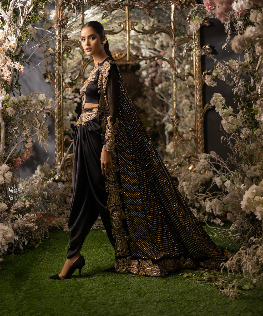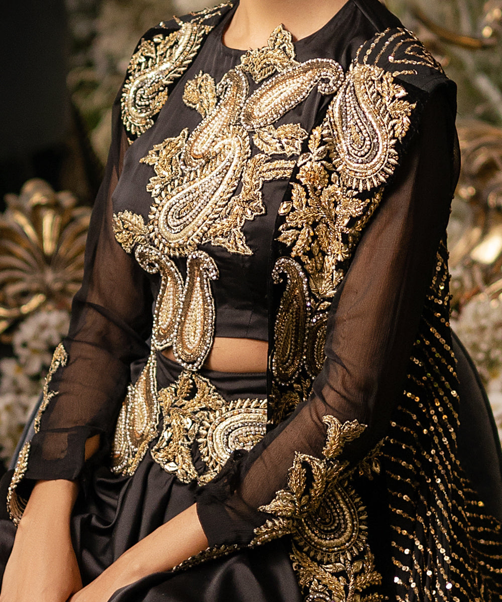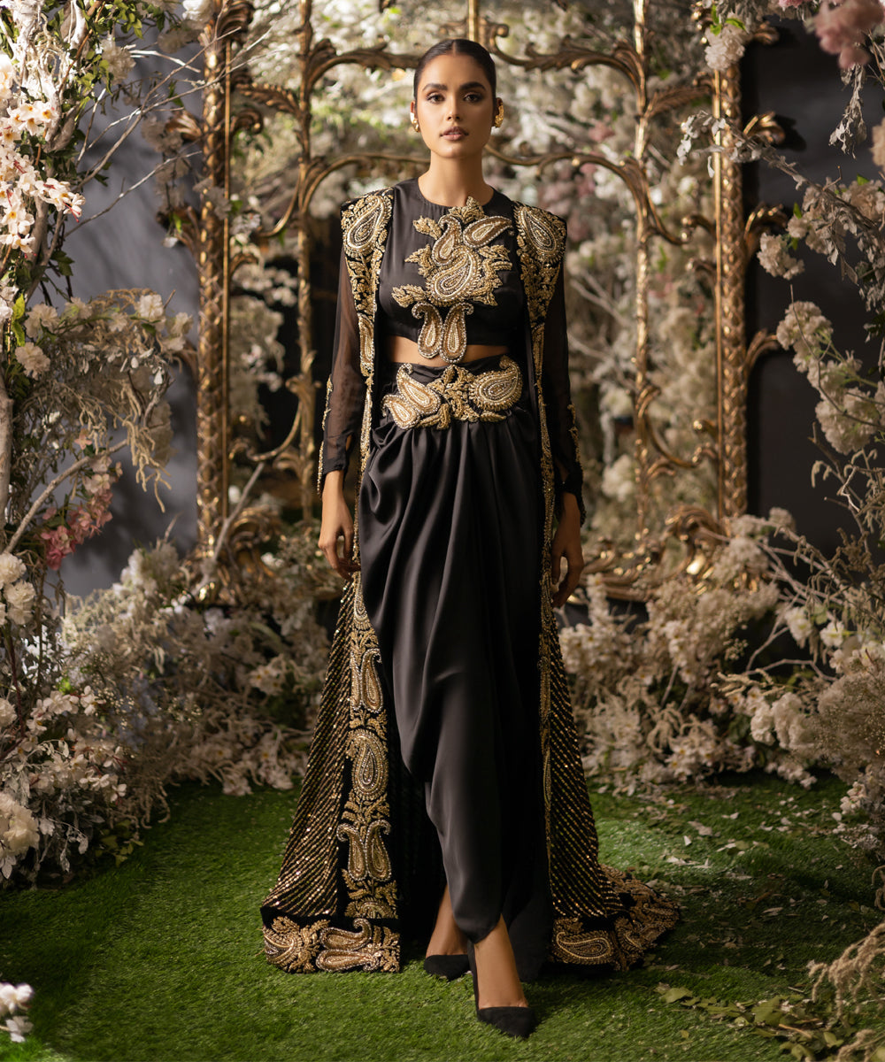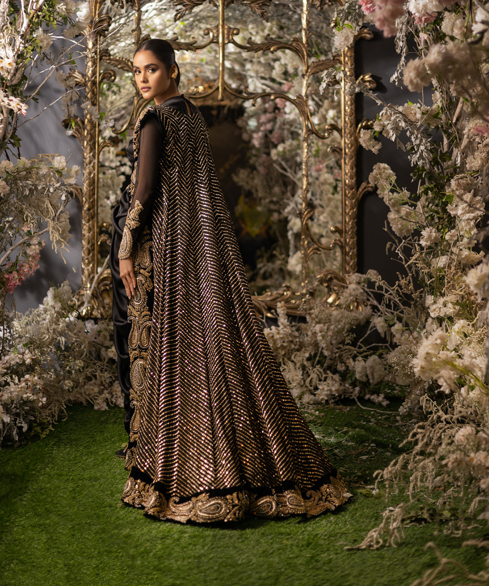 Step into regal opulence with this heavily embroidered, voluminous jacket, blouse, and draped shalwar. The intricate gold work creates an aura of luxury, with motifs gracing both the blouse and shalwar pleats. Customizable to a standard inner shirt and pants, this ensemble seamlessly combines tradition and modern style.