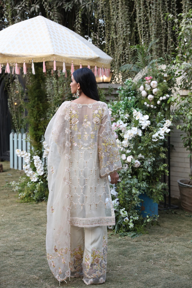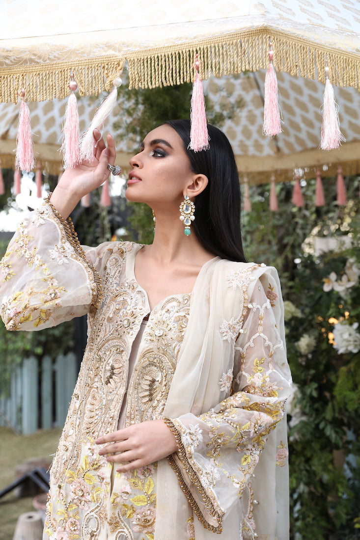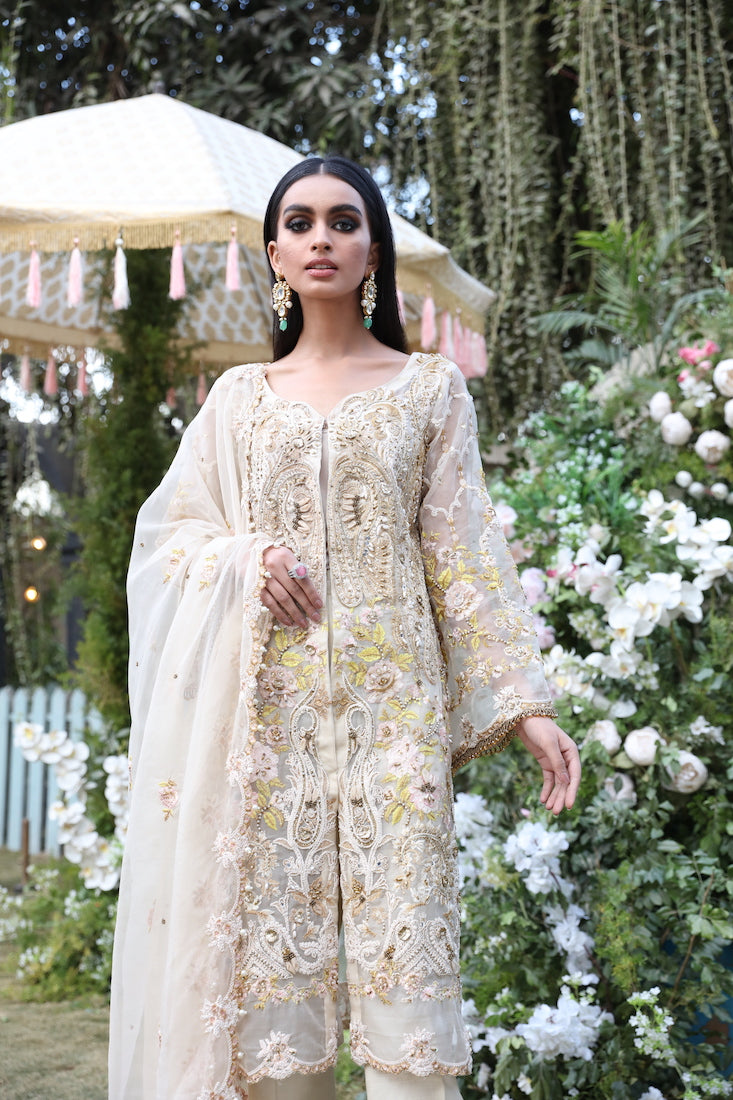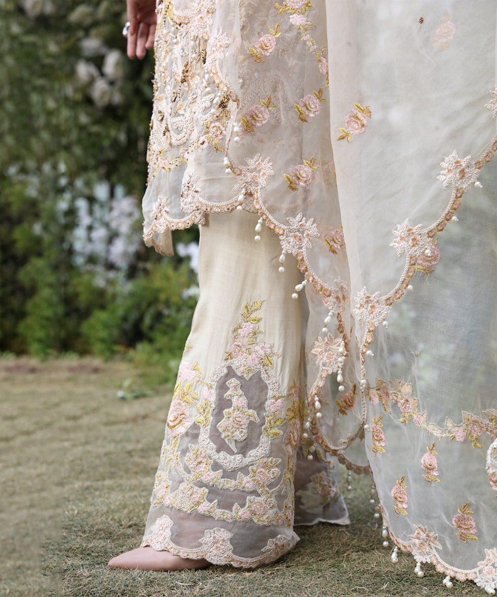 Both styles of the dream beige organza outfit offer stunning and outstanding looks, blending modern and traditional elements. The use of embroidery, cutwork borders, draped silk skirts, and embellishments adds depth and charm to the ensemble, making it truly elegant and enchantingdes on the elbow
