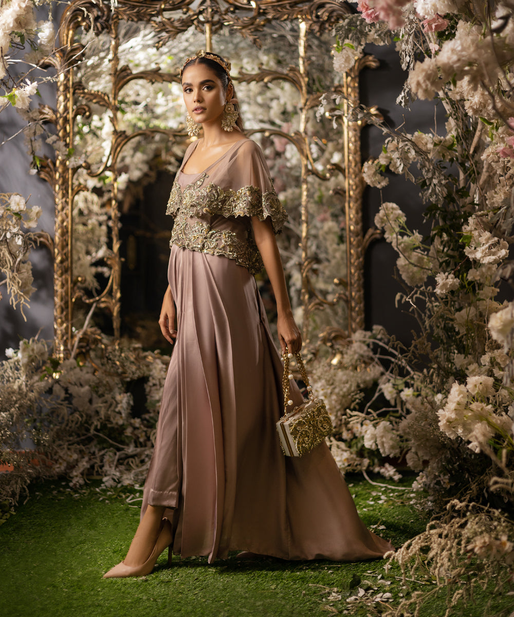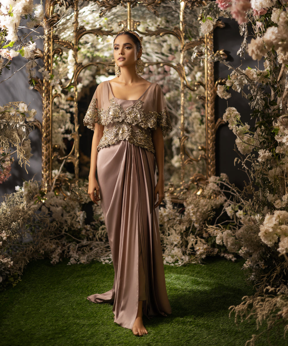 Elegance meets opulence in this Roman silk draped gown featuring a hand-embellished net cape-like bodice paired with matching pants. The gown, crafted from luxurious silk, flows gracefully to the floor, creating a silhouette that exudes timeless beauty. The cape-like bodice is a masterpiece of hand-embellishment, with intricate beadwork and sequins that shimmer and catch the light, adding a touch of royalty to the ensemble. The pants are tailored for comfort and style, ensuring a modern twist to this classic Roman-inspired outfit. Whether worn at a grand soirée or a formal event, this ensemble is a statement of sophistication and refinement, embodying the essence of ancient Roman grace and modern allure.