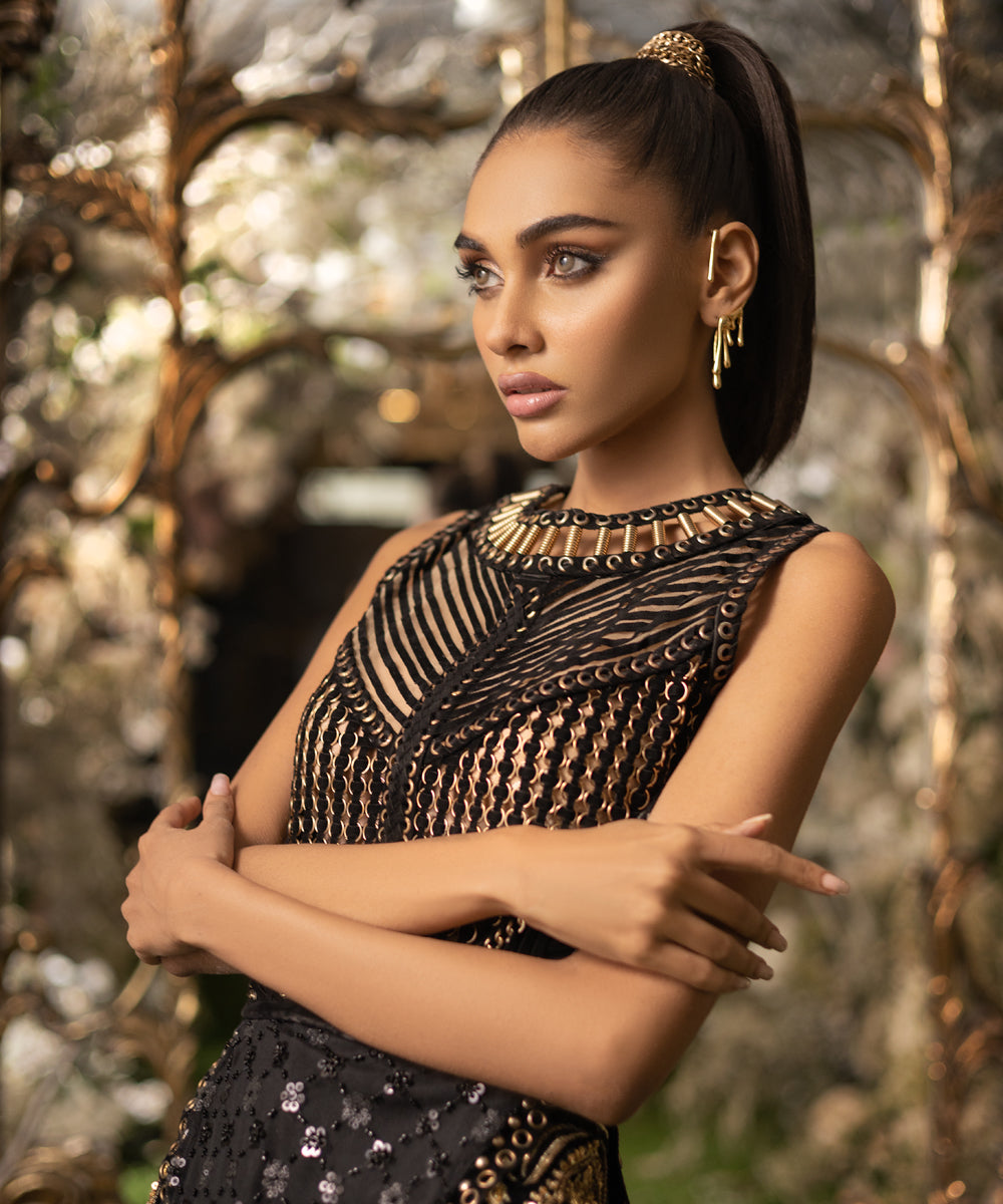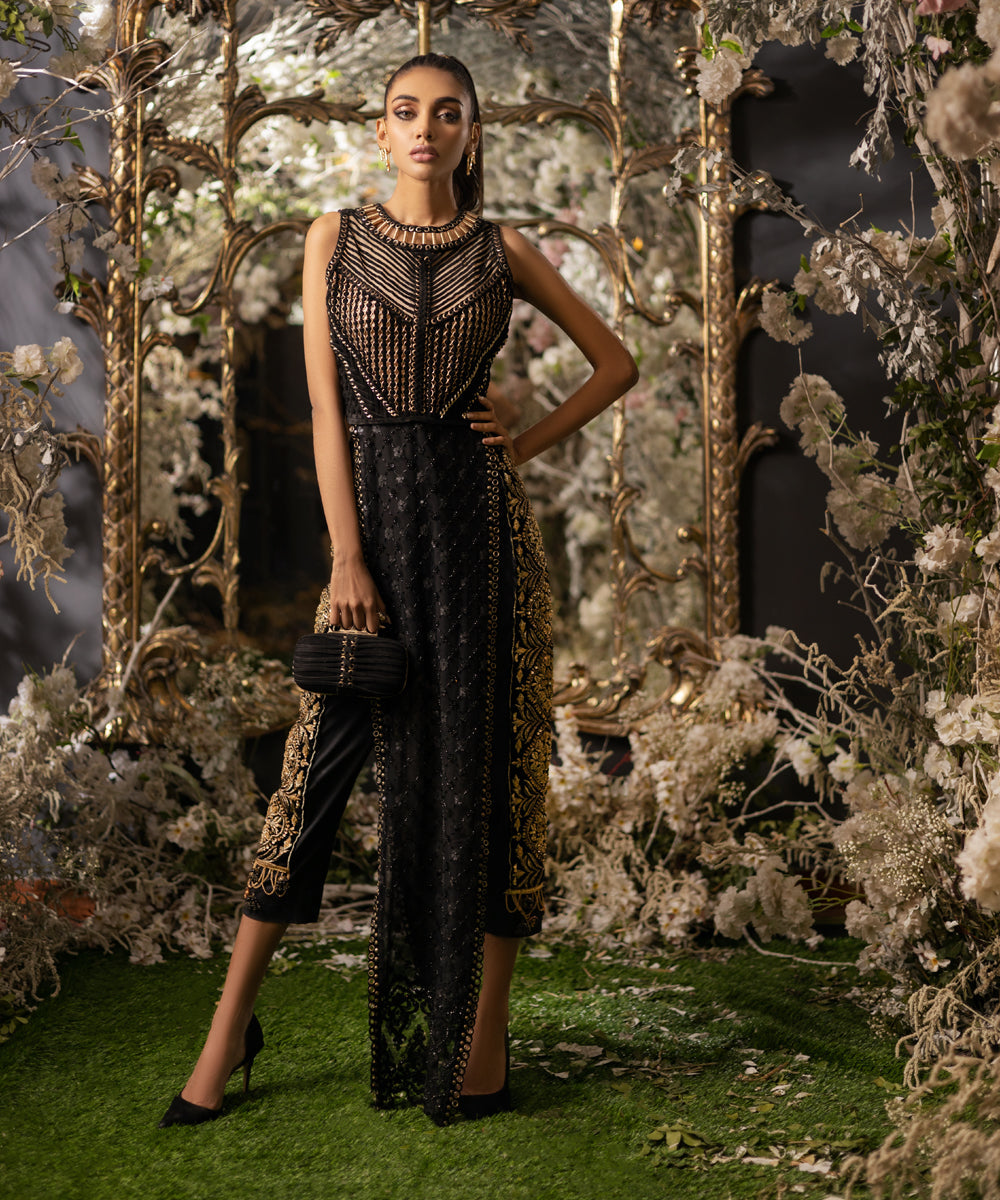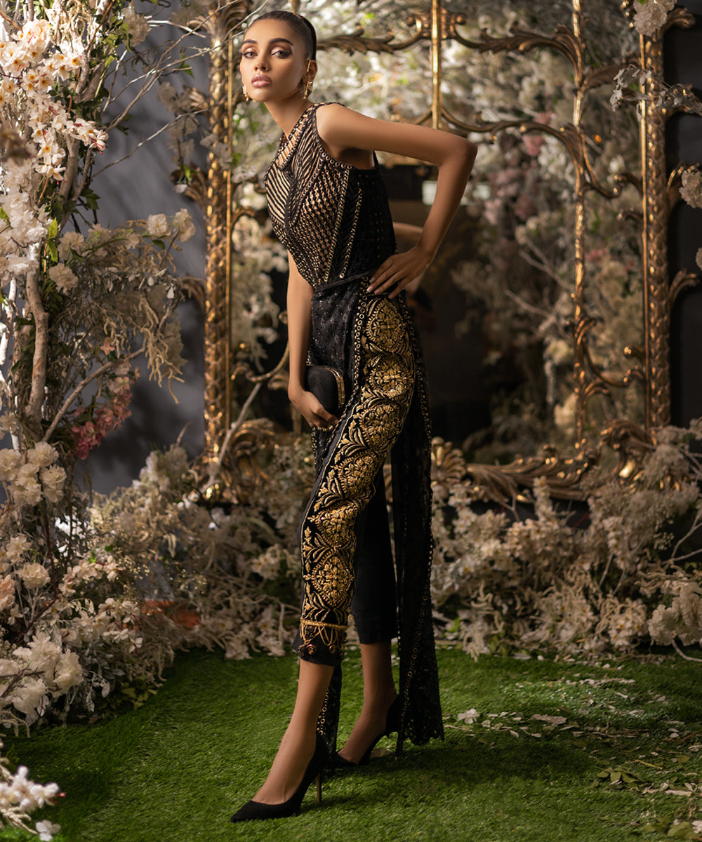 Elevate your style with this Gothic regal outfit. The unique suede techniques with brass chains, rivets, rings, and gold pipes add a touch of opulence. The bottom shirt, adorned with black self-embroidery of beads, sequins, and rivets, exudes sophistication. The high-waisted matador-inspired pants feature heavy gold work visible on the sides of the shirt. Wear it as a complete ensemble or pair the pants with a simple top for a versatile and striking look.