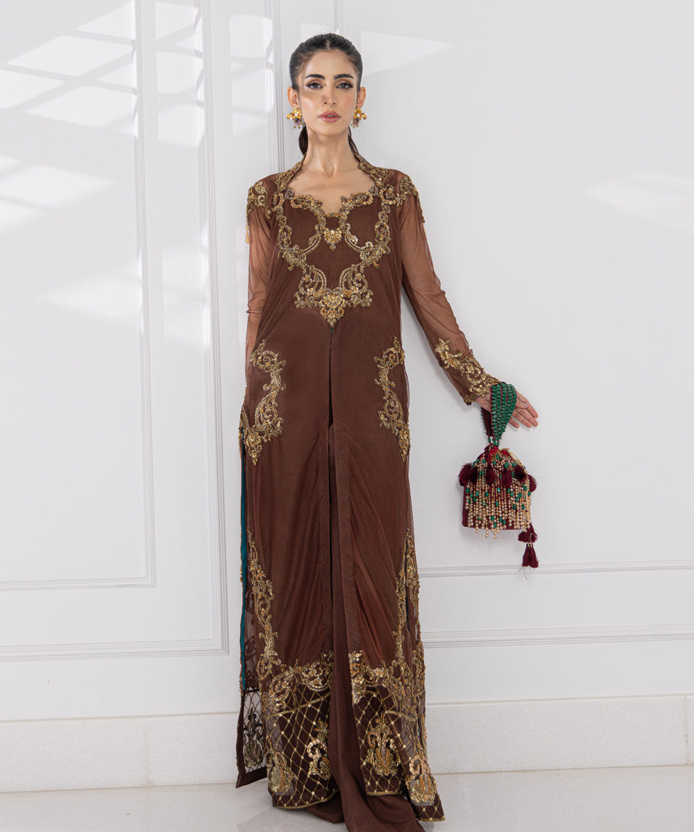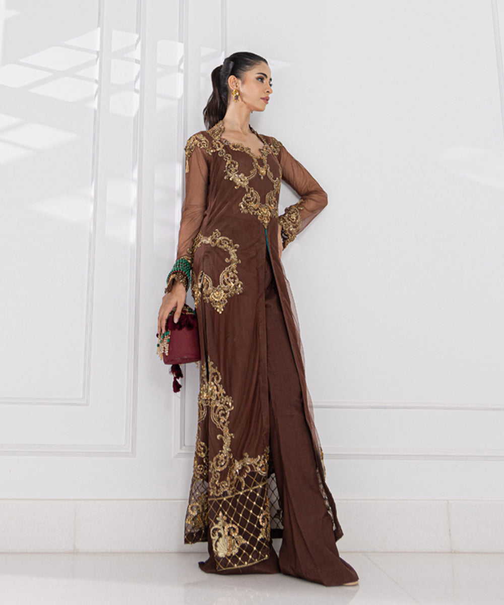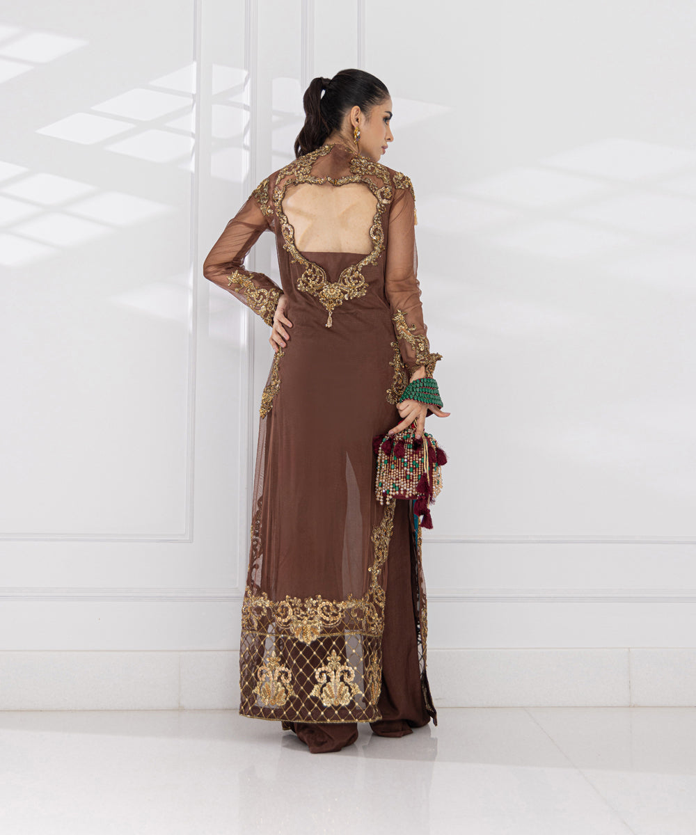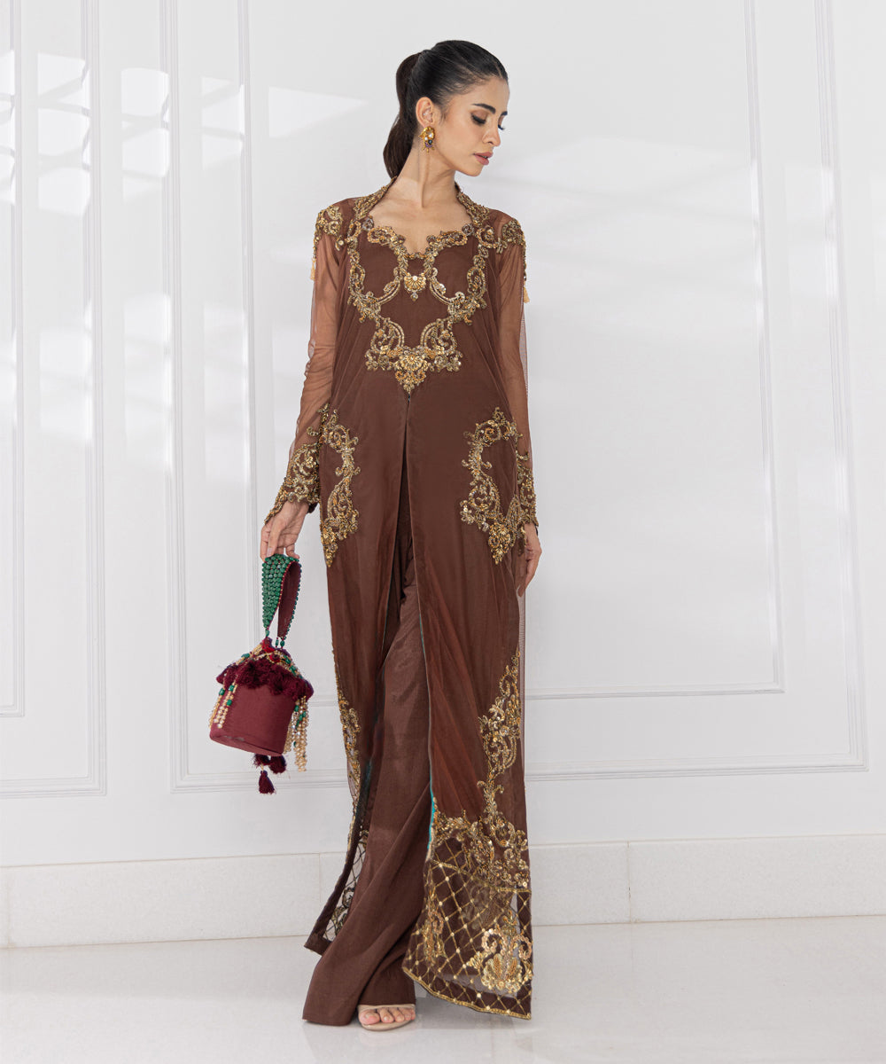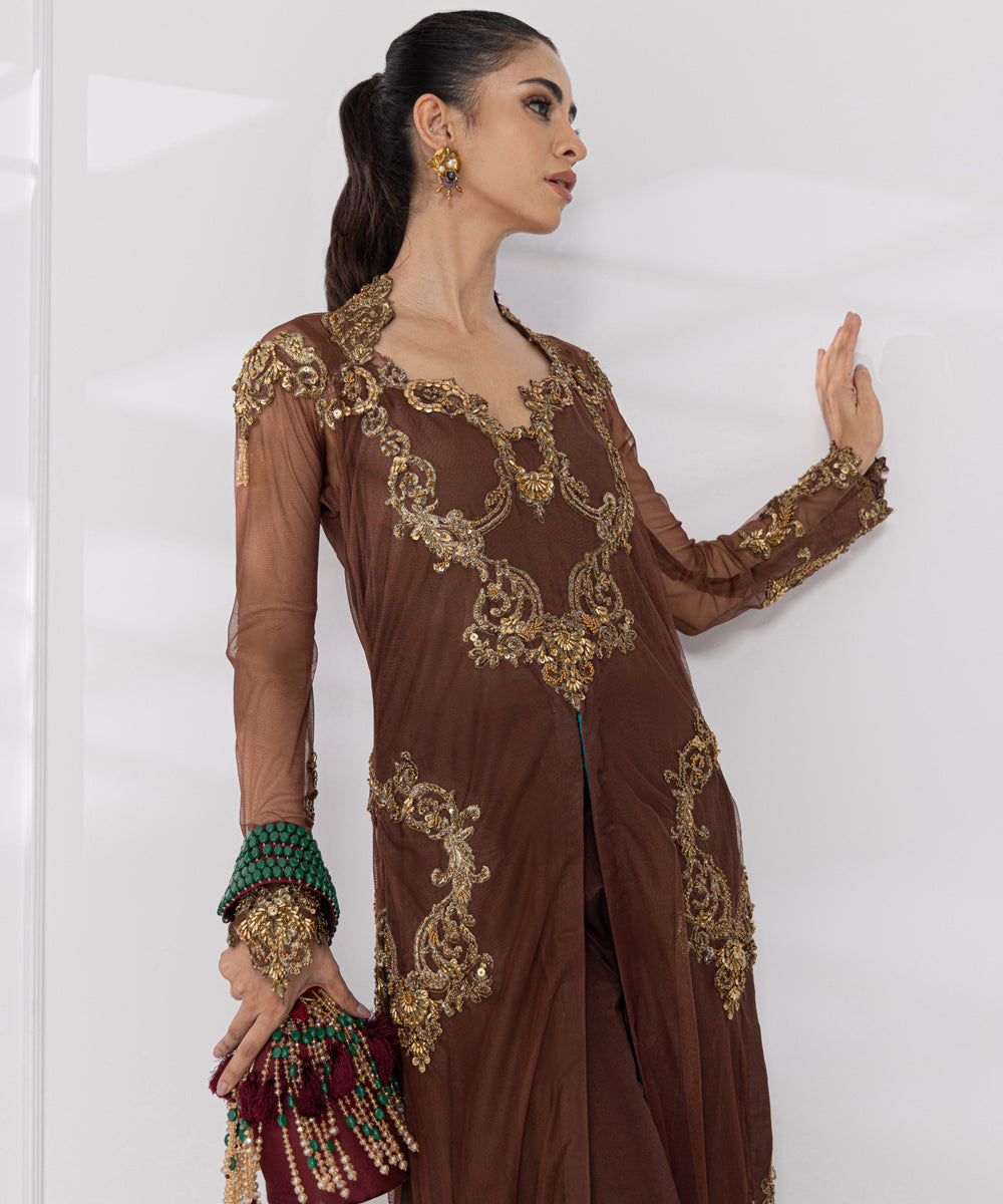 This silhouette is a timeless front-open jacket, designed from deep, lustrous brown net fabric. The piece is enhanced with gold-guided hand embroidery, featuring intricate gold threads and beads meticulously placed along the neckline, waist, and hem. The back boasts a striking gilded regal motif, creating a head-turning statement with its opulent design.