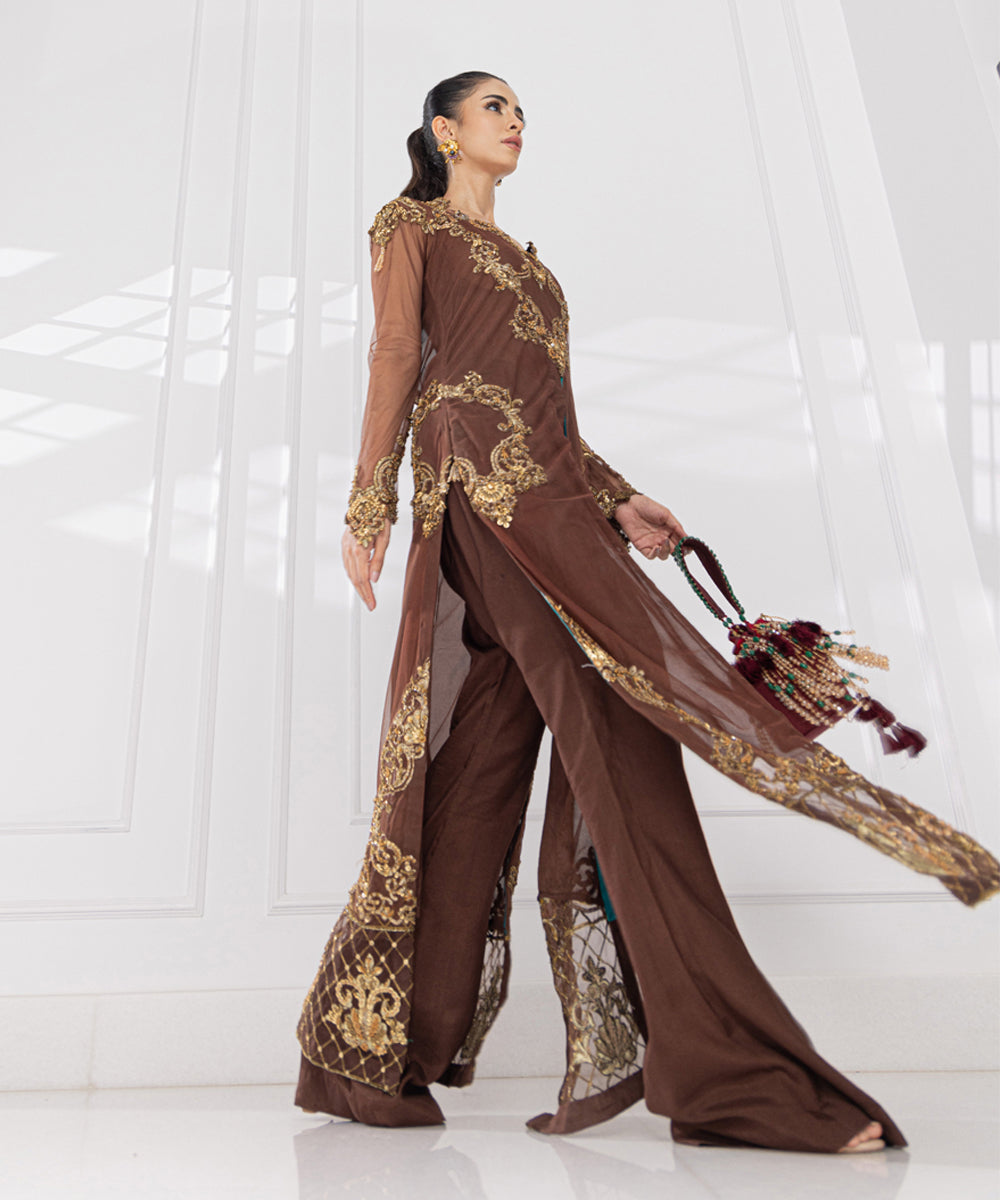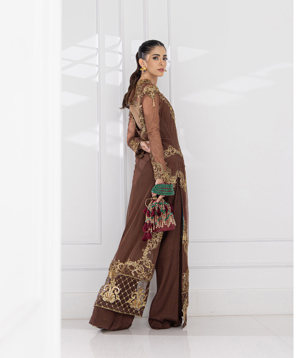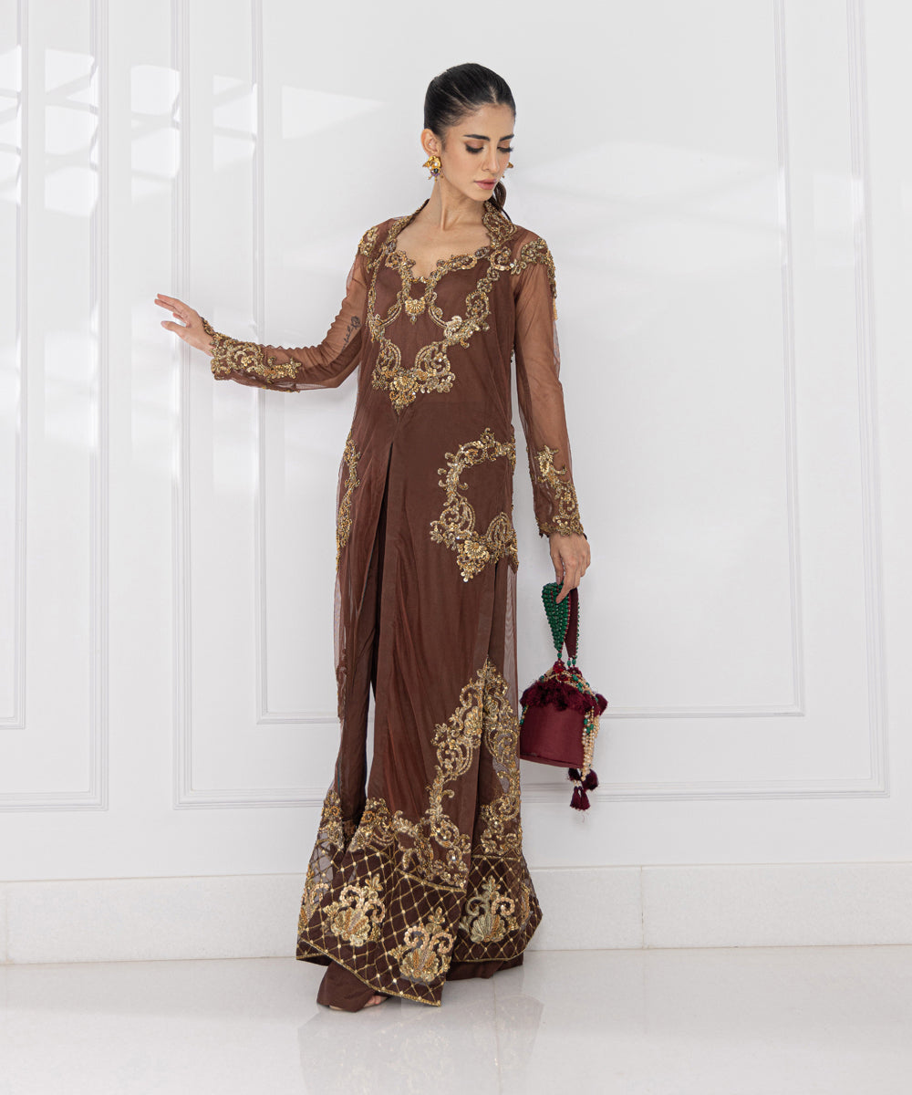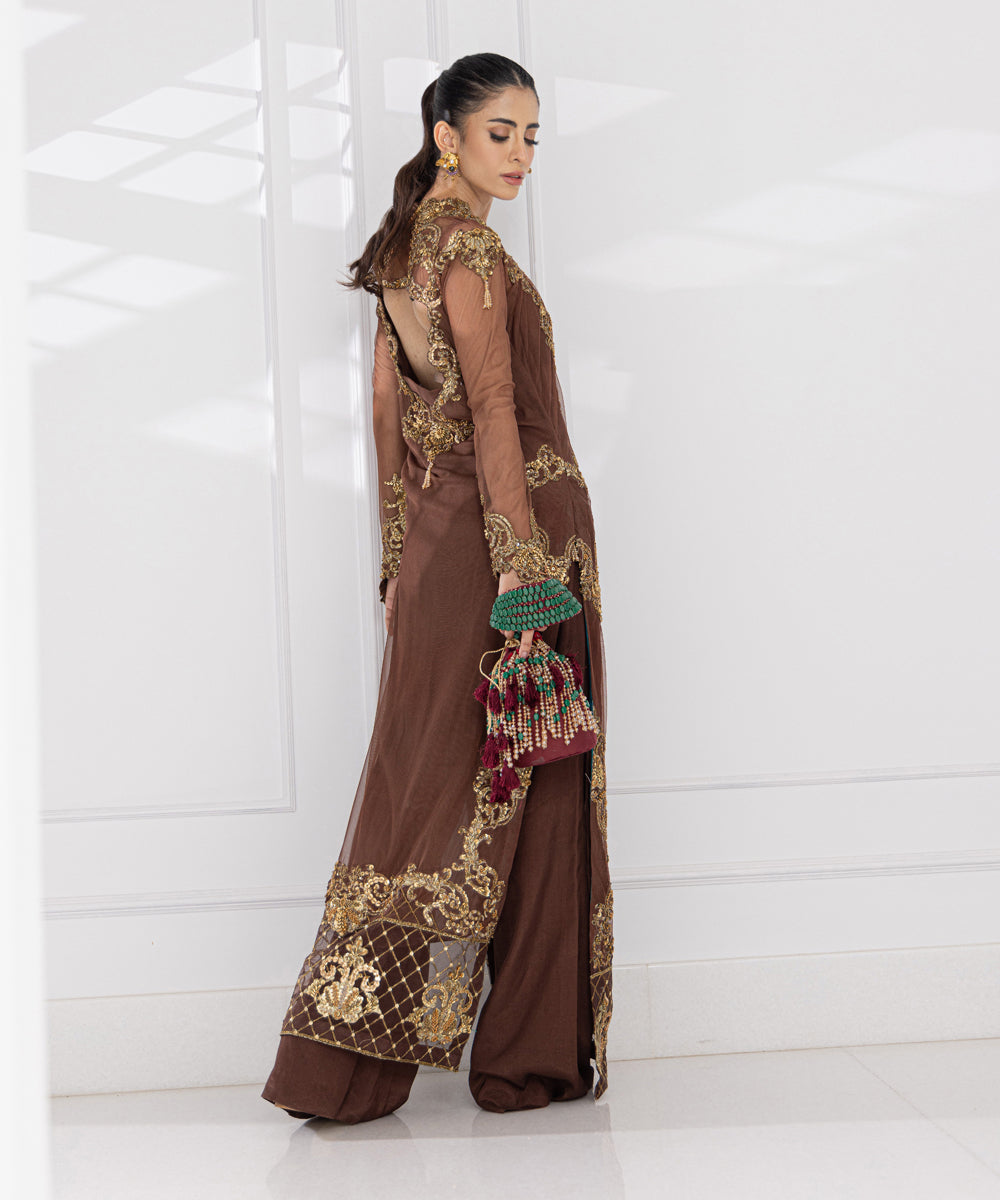 This silhouette is a timeless front-open jacket, designed from deep, lustrous brown net fabric. The piece is enhanced with gold-guided hand embroidery, featuring intricate gold threads and beads meticulously placed along the neckline, waist, and hem. The back boasts a striking gilded regal motif, creating a head-turning statement with its opulent design.