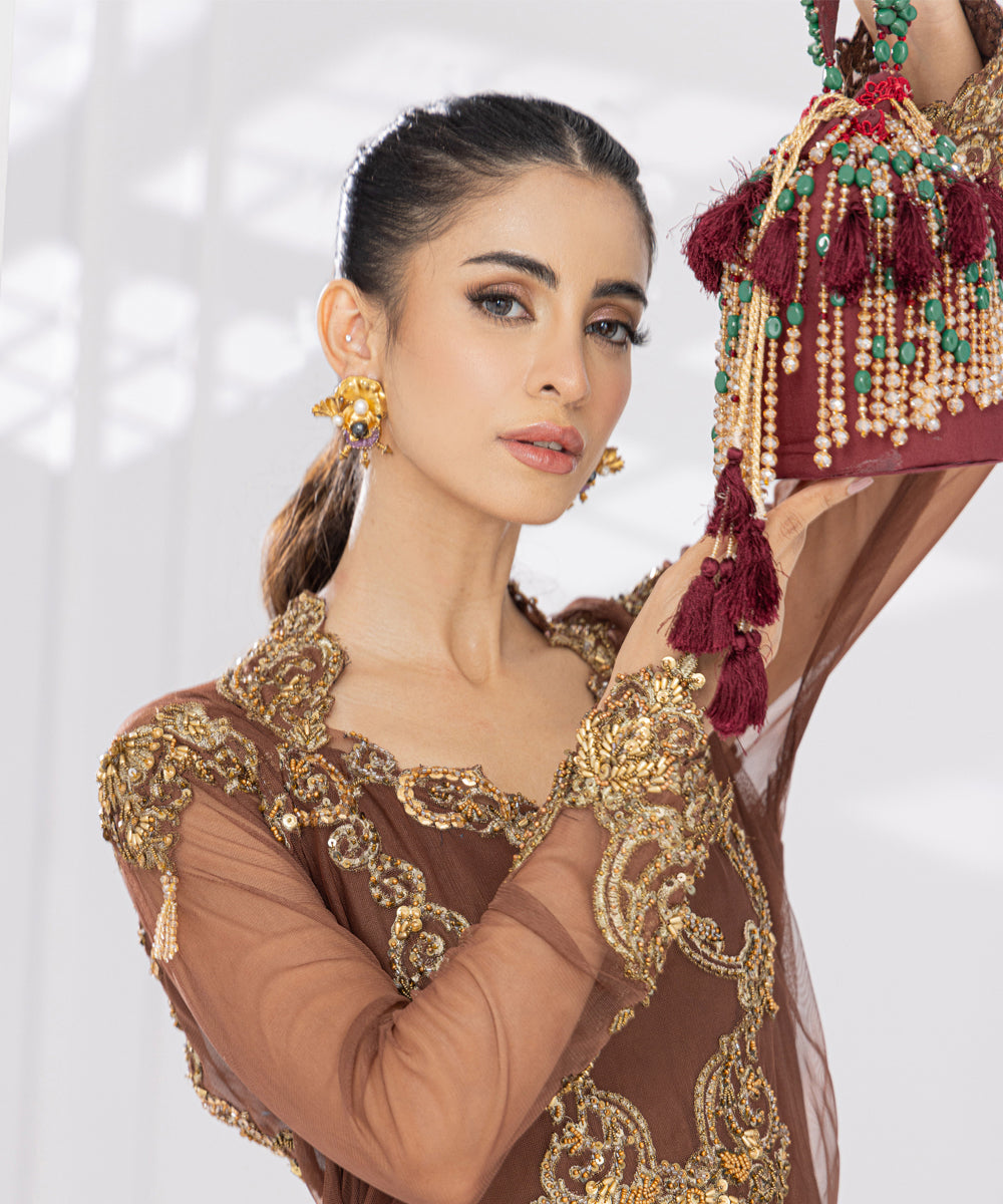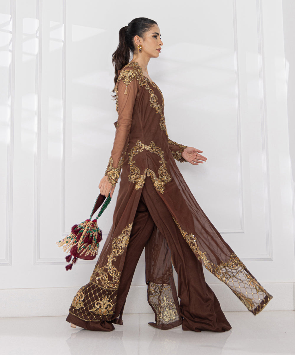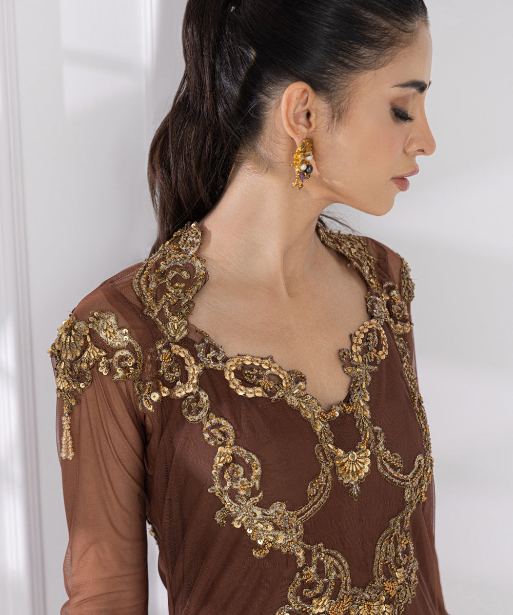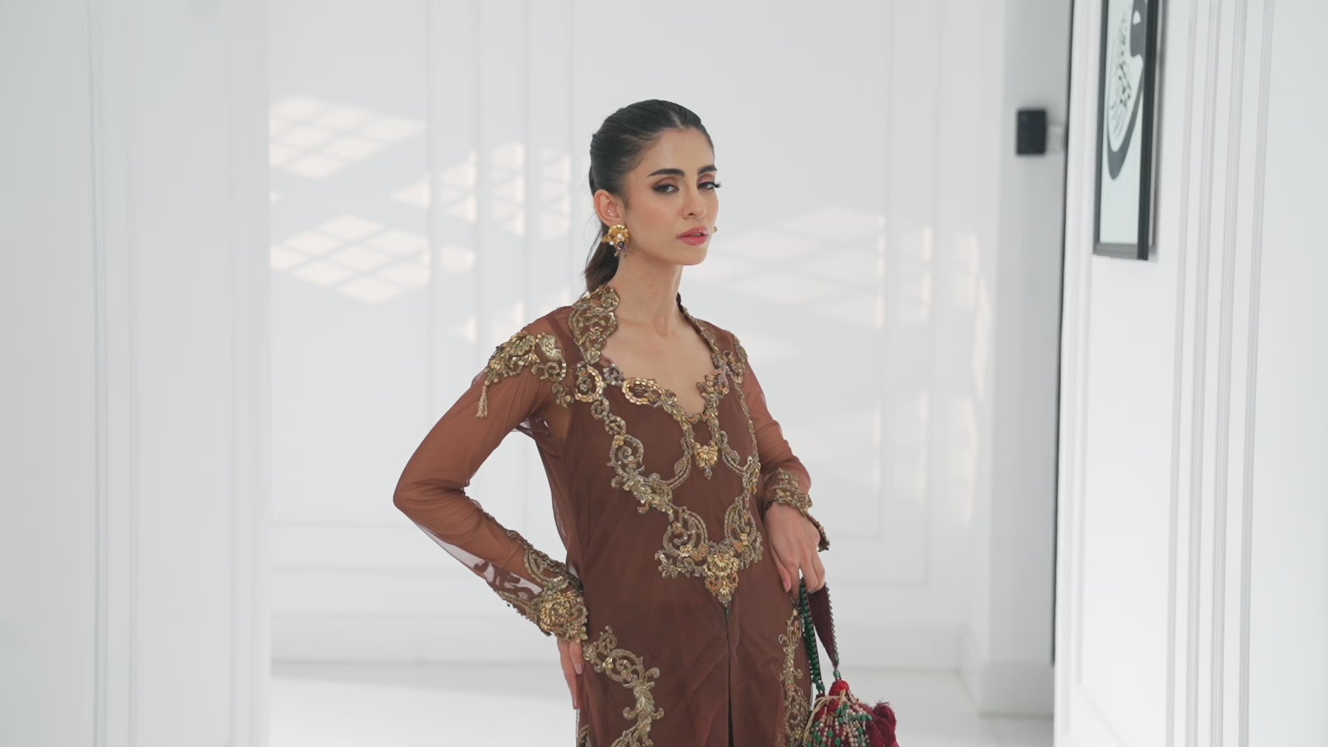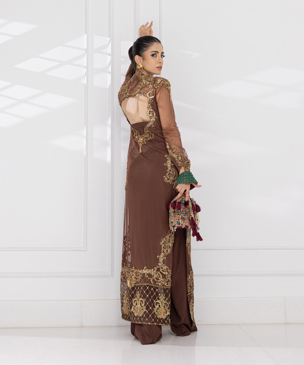 This silhouette is a timeless front-open jacket, designed from deep, lustrous brown net fabric. The piece is enhanced with gold-guided hand embroidery, featuring intricate gold threads and beads meticulously placed along the neckline, waist, and hem. The back boasts a striking gilded regal motif, creating a head-turning statement with its opulent design.