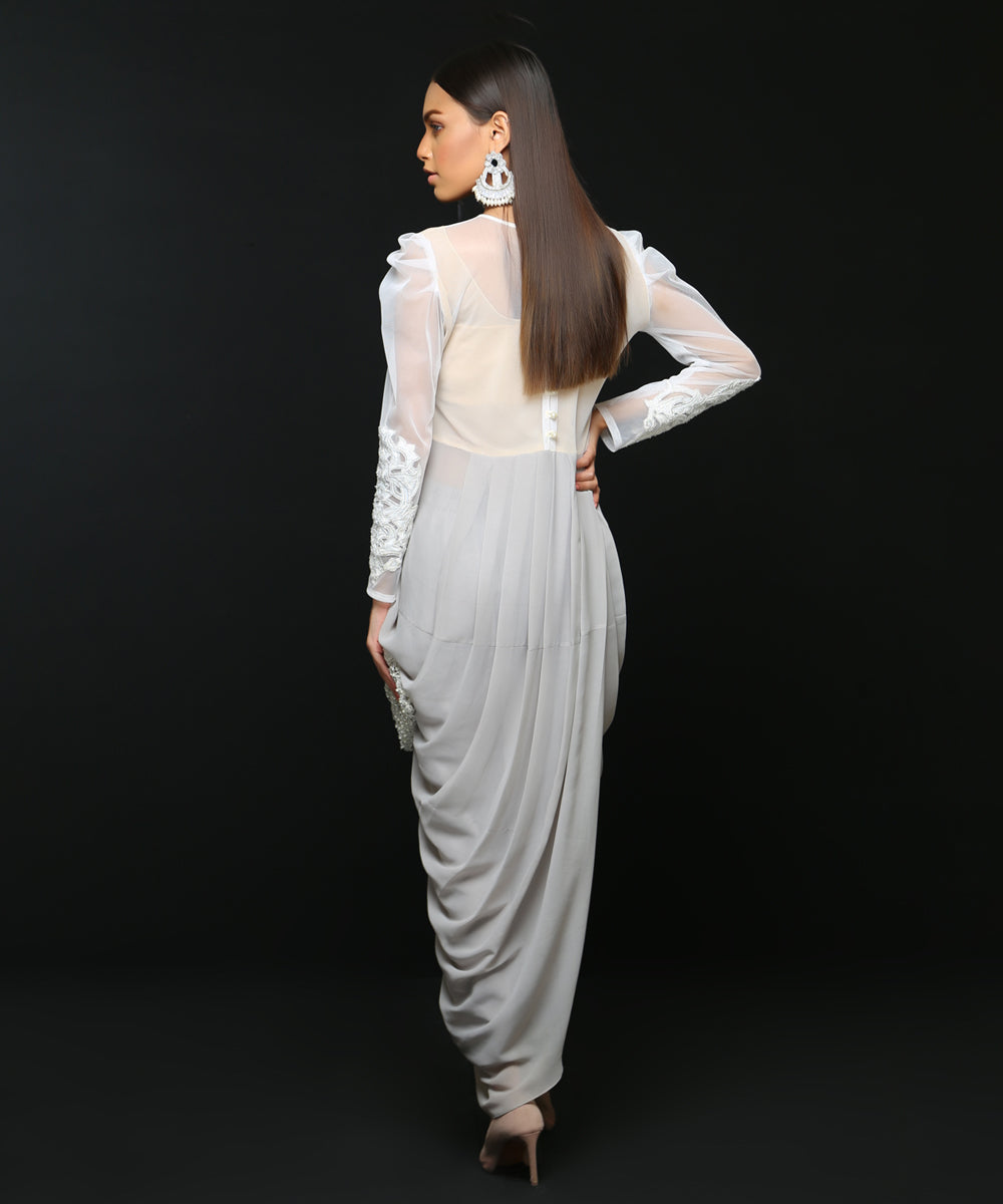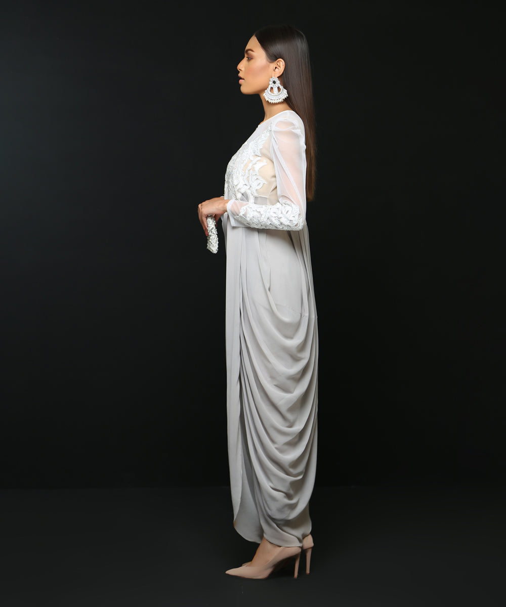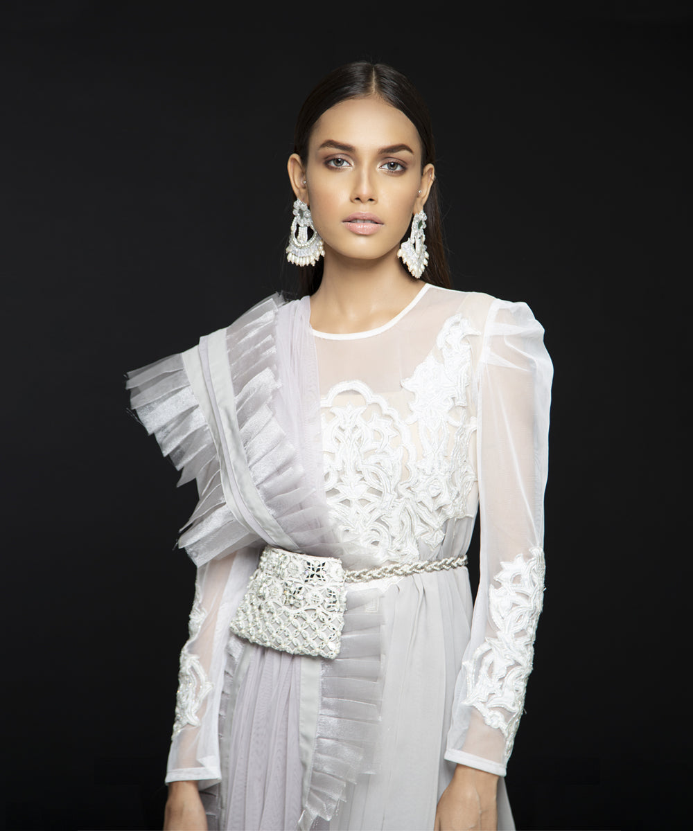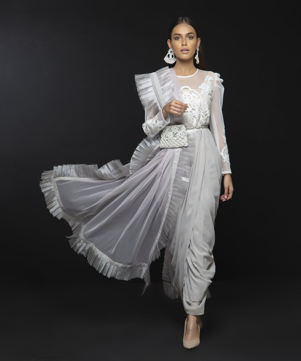 Net handworked bodice with chiffon georgette Waterfall draped goen shirt. Paired with rawsilk pants. Chiffon georgette dupatta with 4 sided organza pleates (Dupatta and belted bag can be added on request)