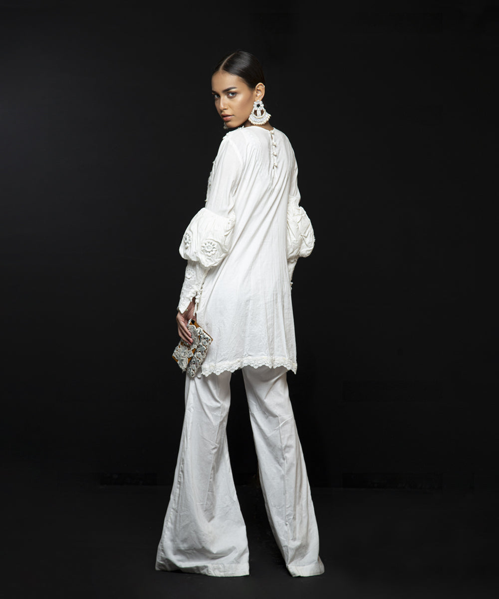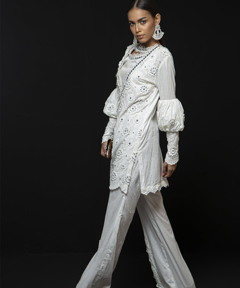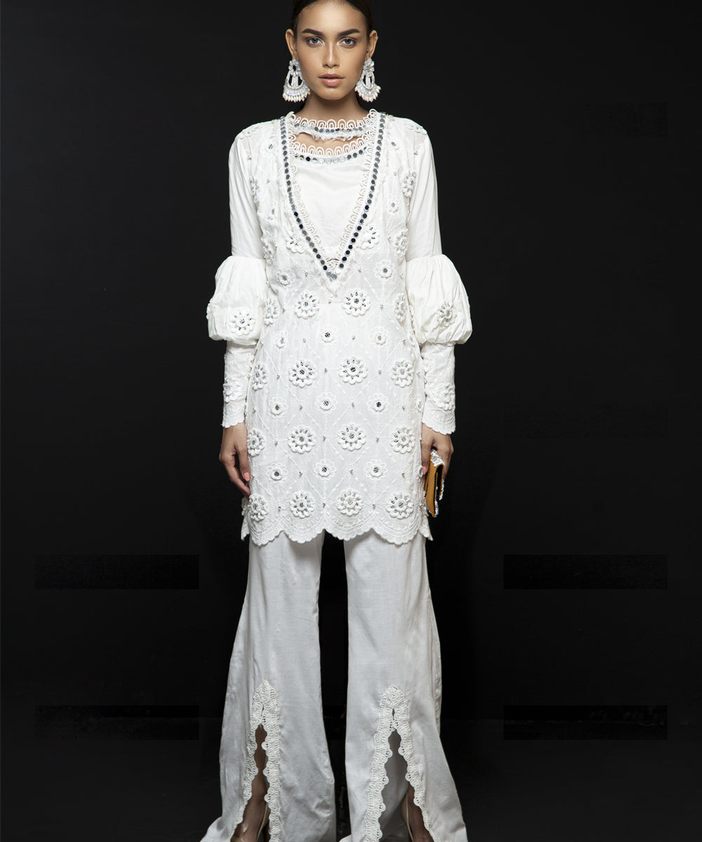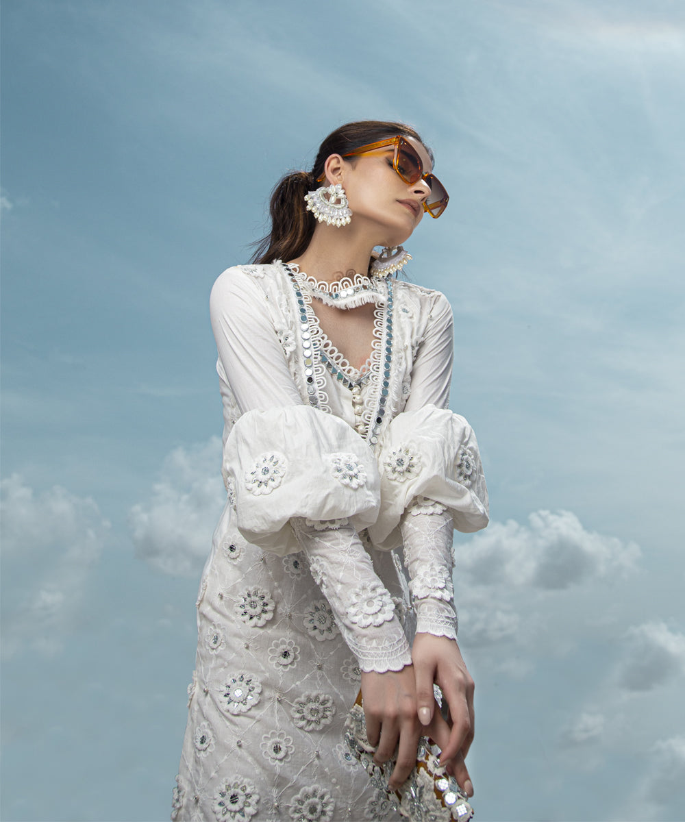 Luxe cotton fabric with 3D self embroidered machine work with added mirror hand work and mirror trimmings on the neck with single Marie puff at the elbow. Normal sleeves can be added on request.