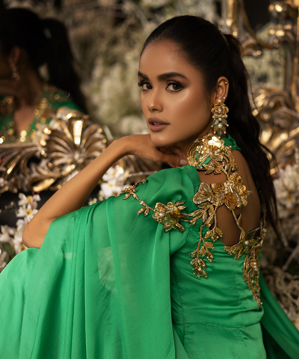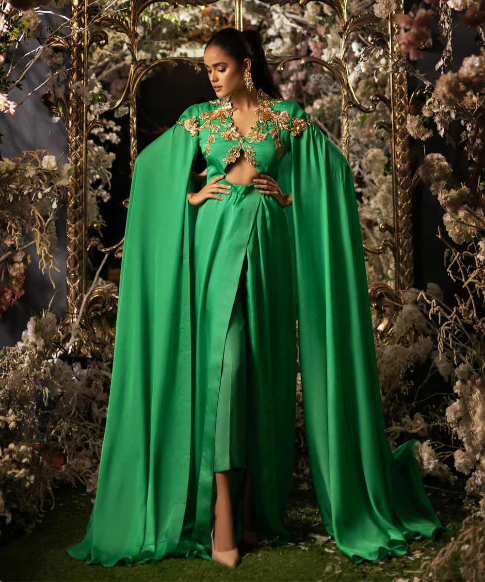Step into the regal world of a Sultana with this rich emerald green Arabic-inspired silk gown. The captivating cape sleeves exude a queen Sultana look, while the front-open gown is adorned with regal gold 3D work that extends all the way to the back. Paired with matching green silk pants, this ensemble embodies sophistication and grace, fit for a queen in every sense.