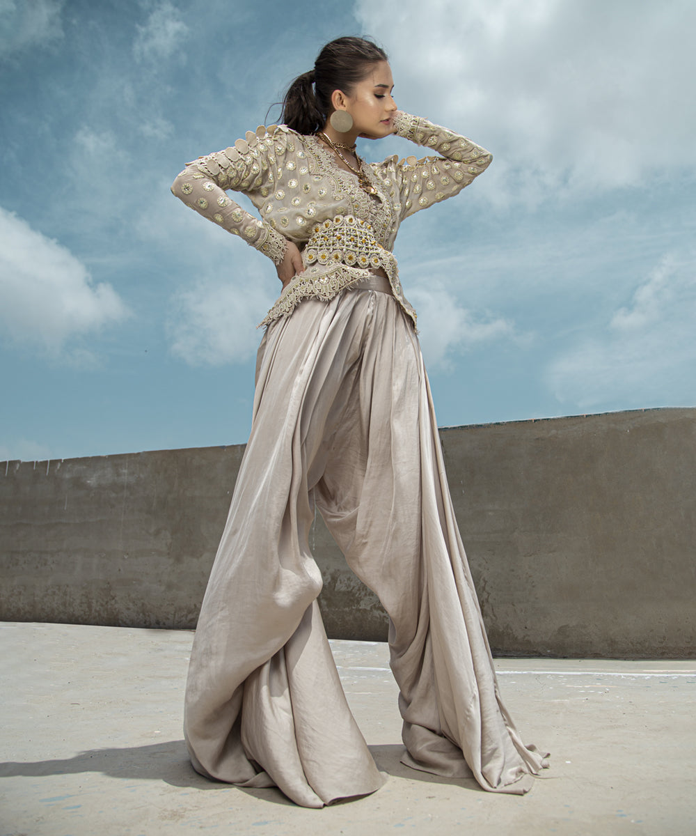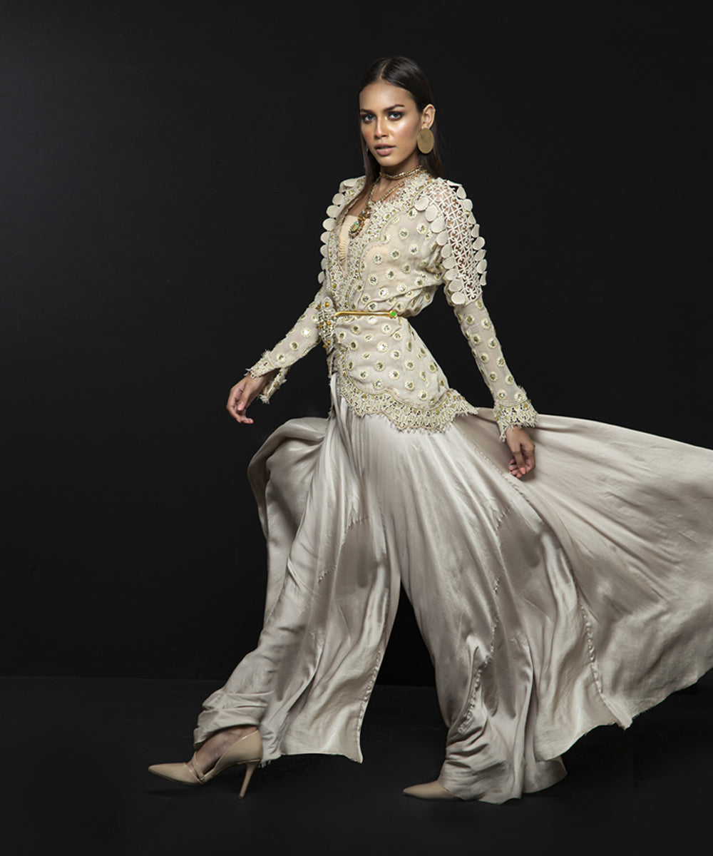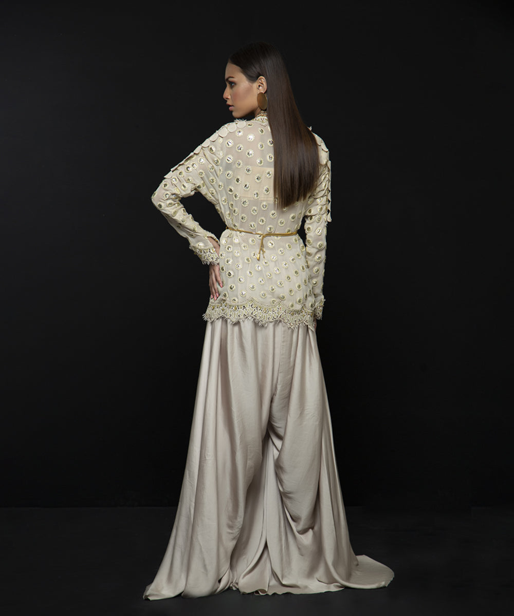 Ivory gold mirror foiled jacket with machine embroidery on the neck and bottom with draped silk pants (with lining) | Purse can be added on request.