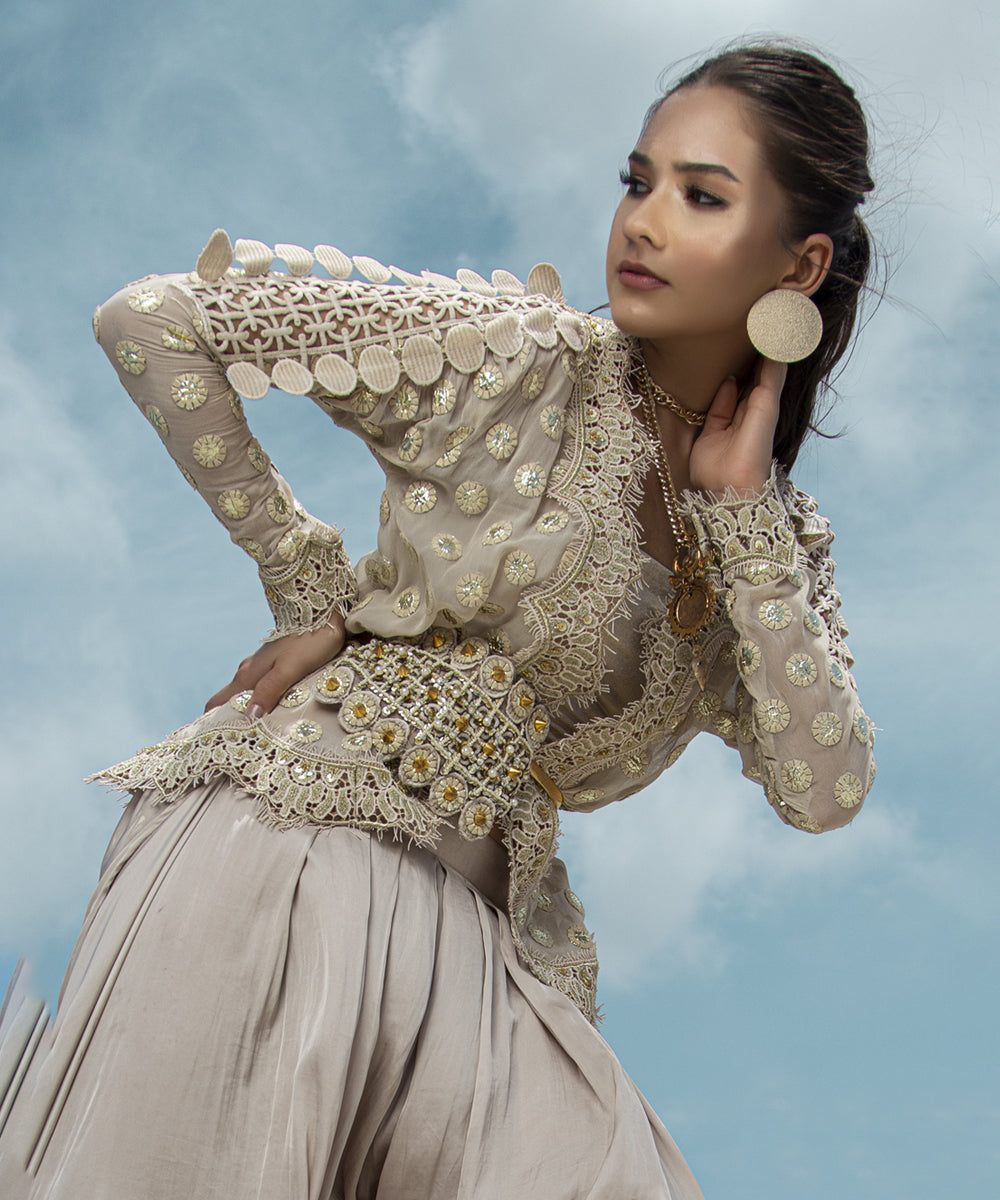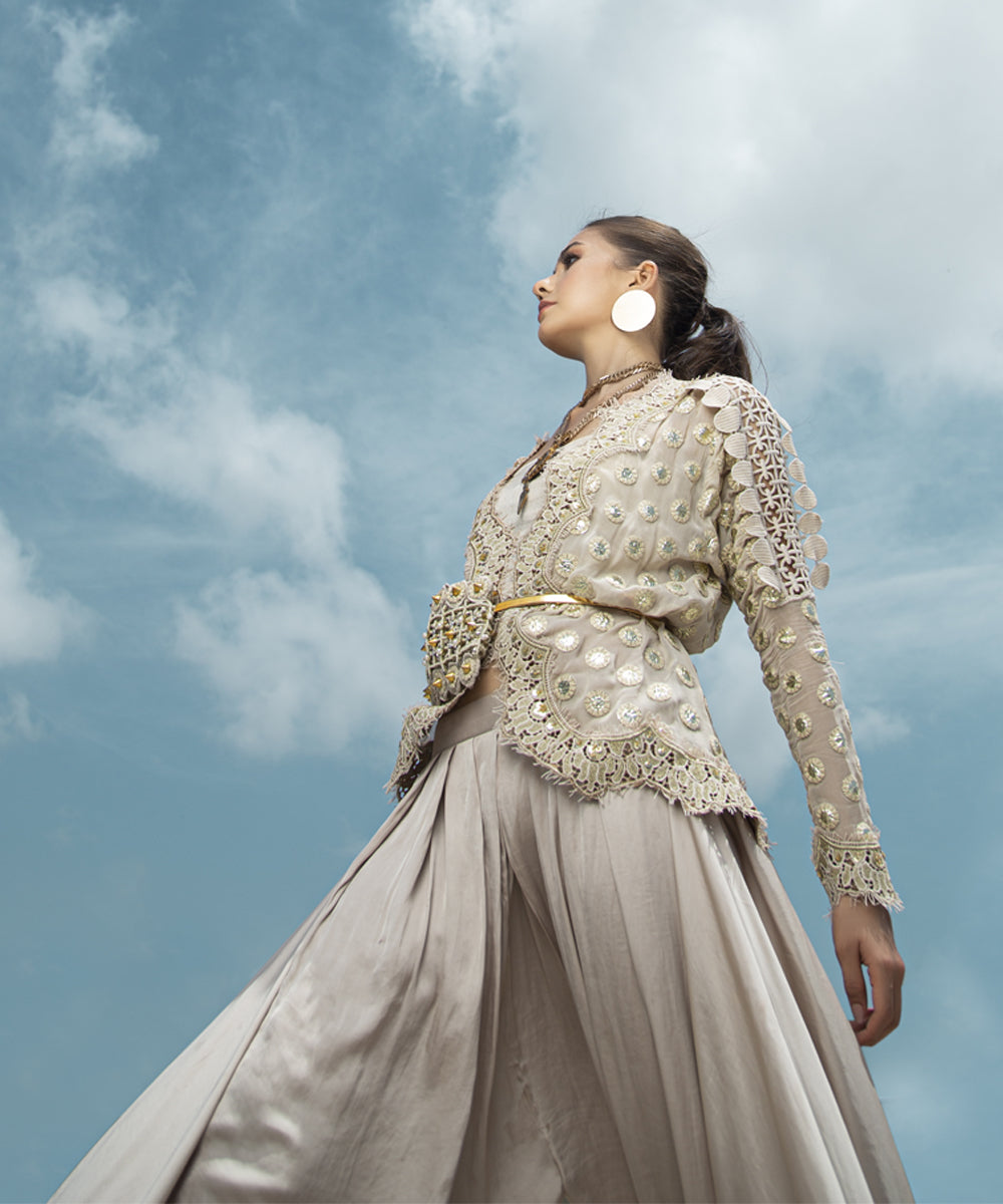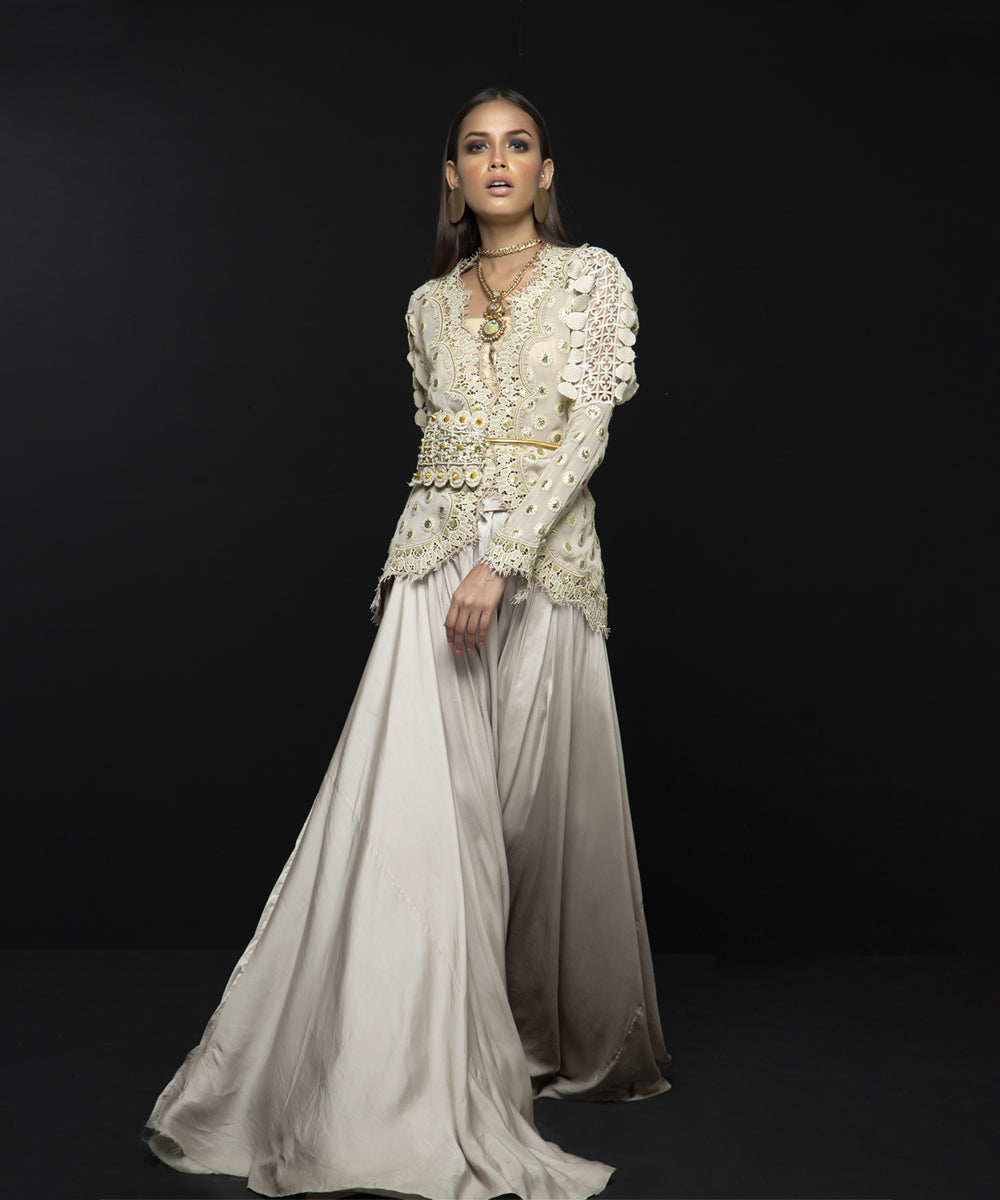 Ivory gold mirror foiled jacket with machine embroidery on the neck and bottom with draped silk pants (with lining) | Purse can be added on request.