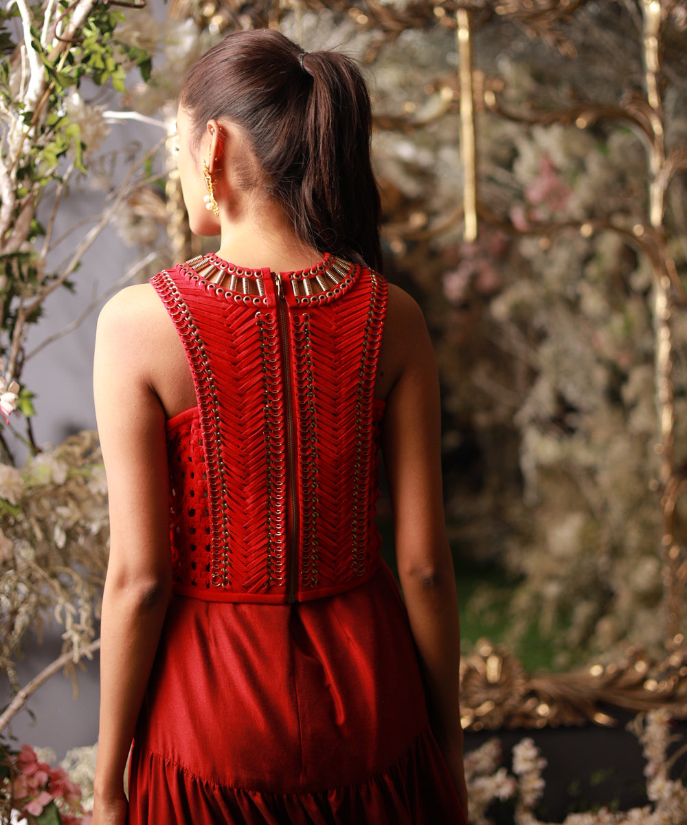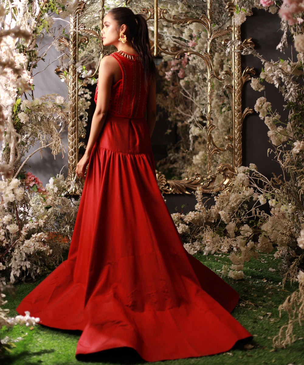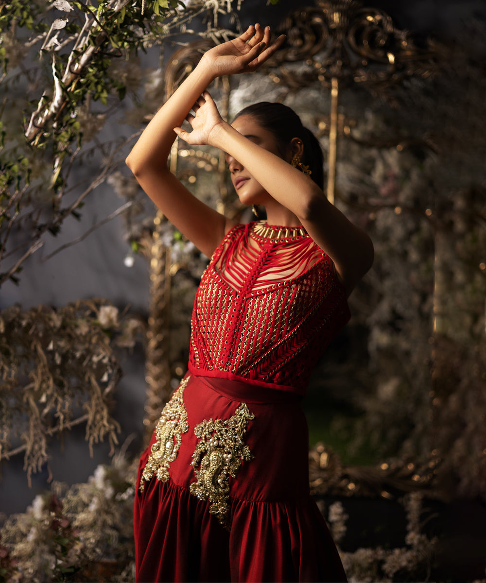 Introducing a stunning two-piece ensemble in deep spicy red crimson: a uniquely crafted blouse and a high-waisted voluminous skirt. The blouse showcases intricate suede techniques adorned with brass chains, rivets, and rings, creating a captivating handcrafted masterpiece. The high-waisted skirt is a vision of opulence, featuring heavy gold regal work from the waist down and enhanced with cancan to add volume and drama. This ensemble is a true masterpiece for those seeking a bold and regal look.
