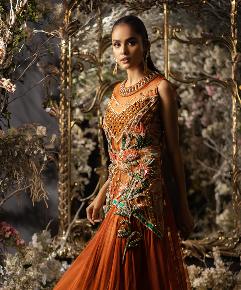 Dazzle in this vibrant orange gown featuring intricate tribal-inspired motifs and stunning 3D floral creative work. The neckline boasts a unique combination of gold pipes, suede weave, and small brass bullets. Adding to its allure, the gown is adorned with exquisite gold work along its border for a truly distinctive and captivating design.