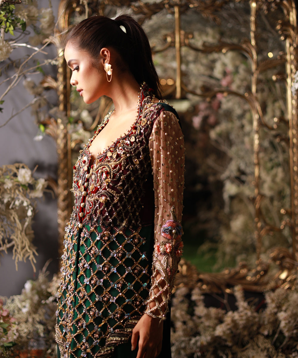 Step into the enchantment of a secret garden with this exquisite jacket. The magenta top bodice features intricate gold work, adding a touch of regal opulence. Below, the deep green velvet jacket, inspired by a Maharani's window peeking into a secret garden, is adorned with heavy embroidery, creating a sense of mystery and allure. The sleeves, crafted from neon pastel pink chiffon fabric, are heavily embellished, adding a modern twist. Paired with plain silk pants, this ensemble combines tradition and contemporary style in a captivating and graceful manner.