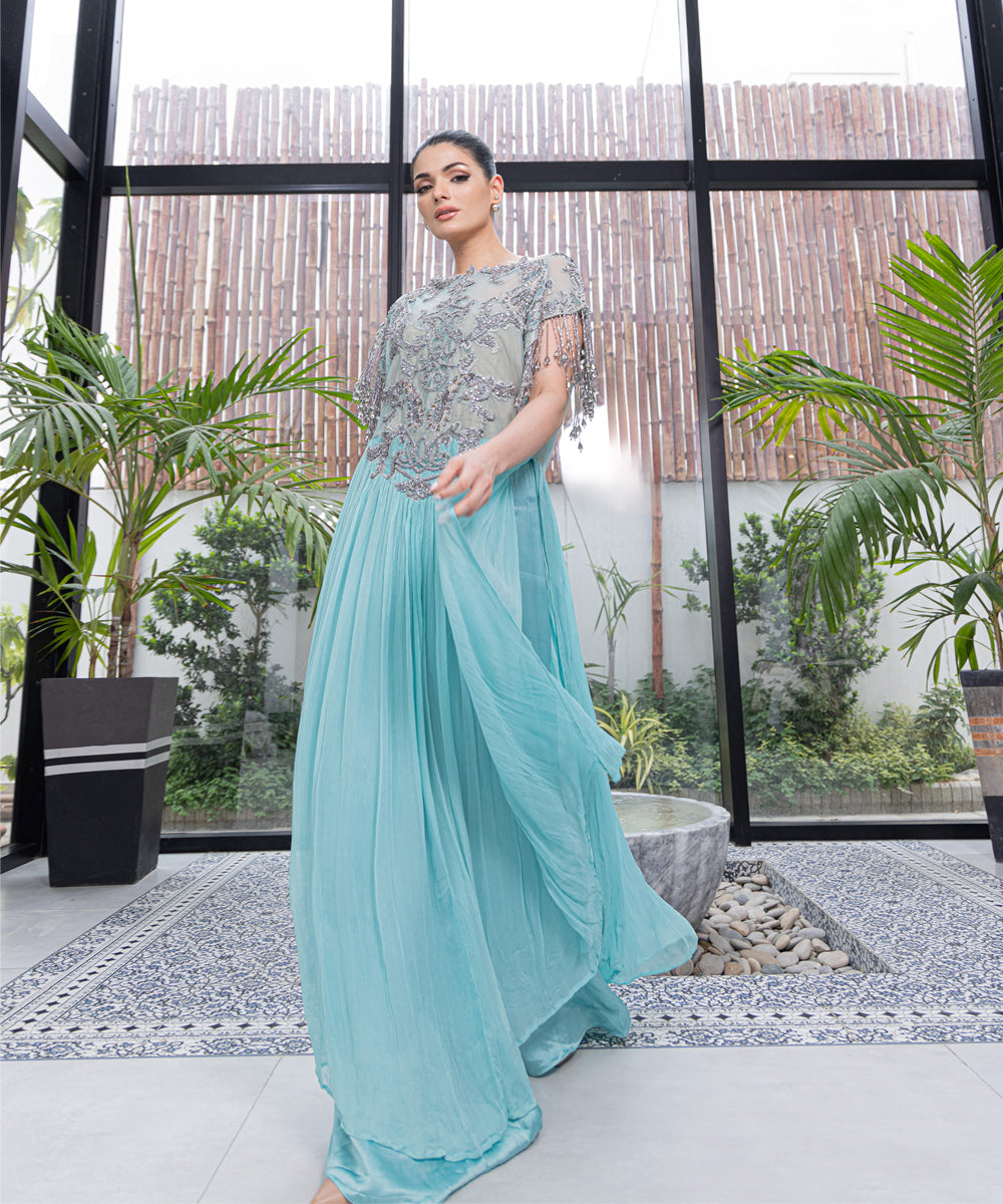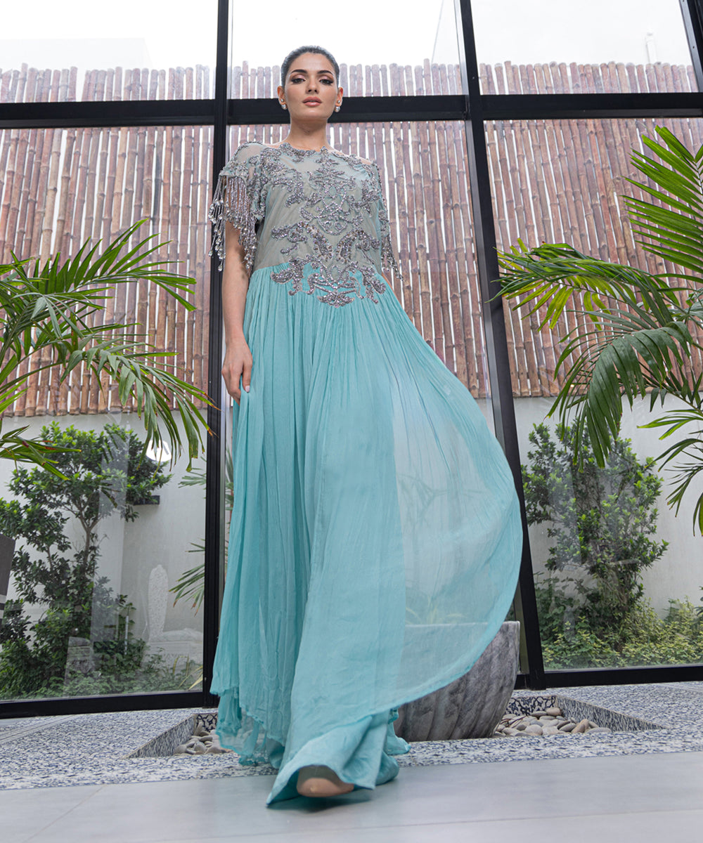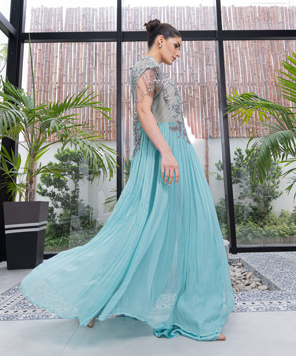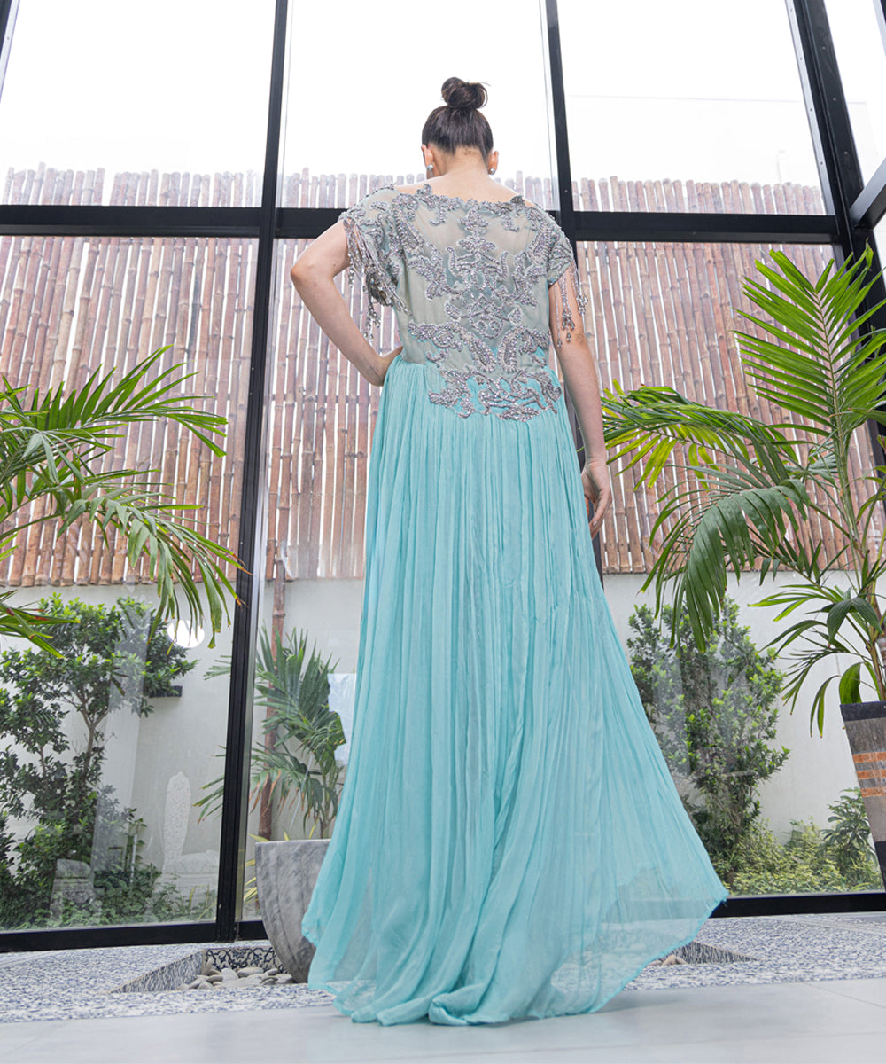 Experience the allure of timeless elegance with this flowing aqua marine crushed gown. Designed to captivate, its soft drapes add graceful movement and a fluidity that enhances every step you take.