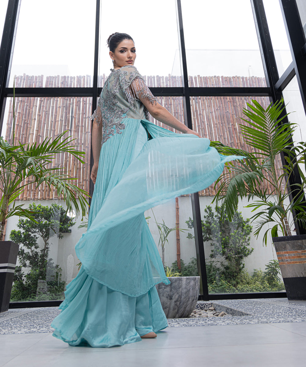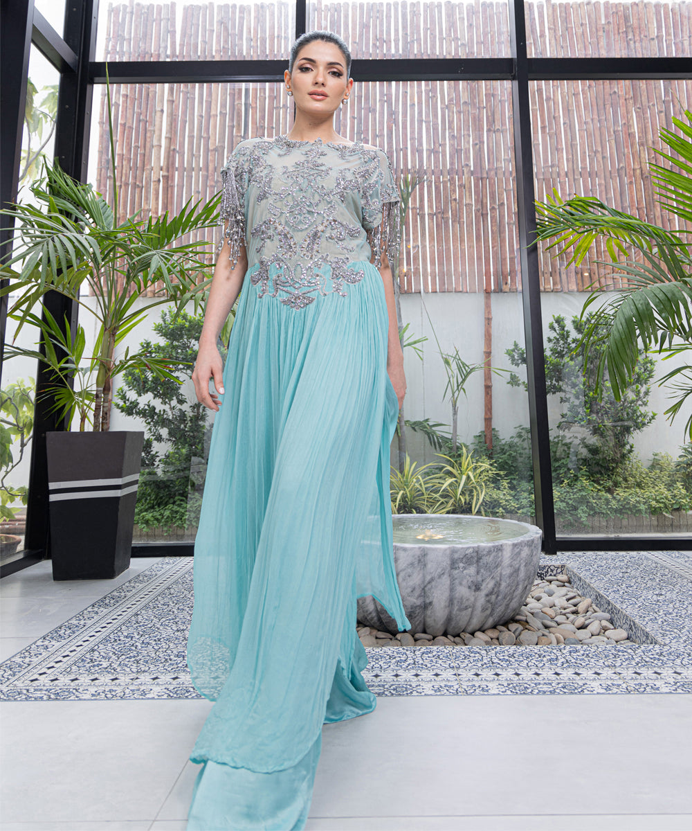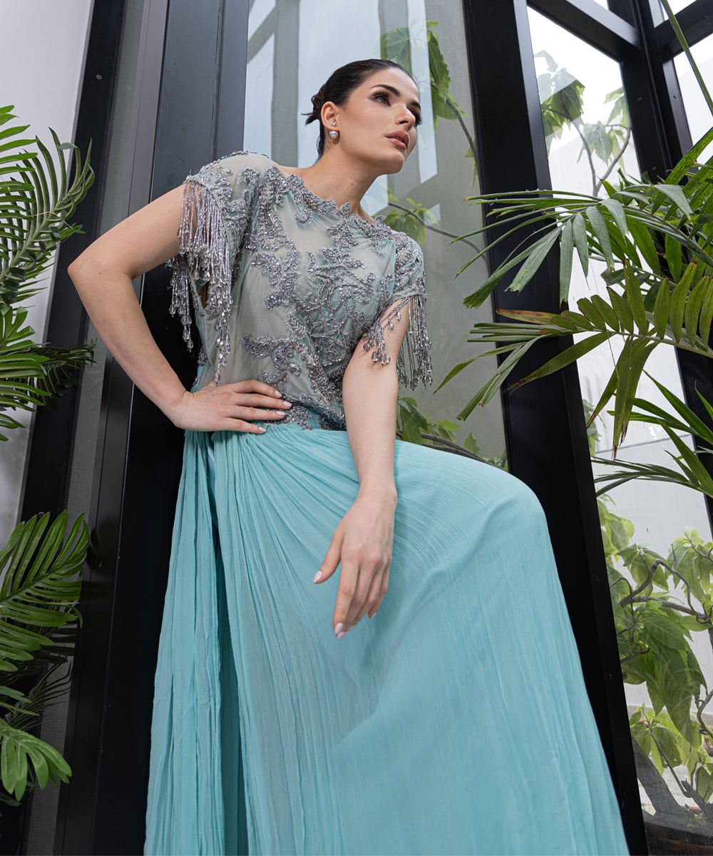 Experience the allure of timeless elegance with this flowing aqua marine crushed gown. Designed to captivate, its soft drapes add graceful movement and a fluidity that enhances every step you take.