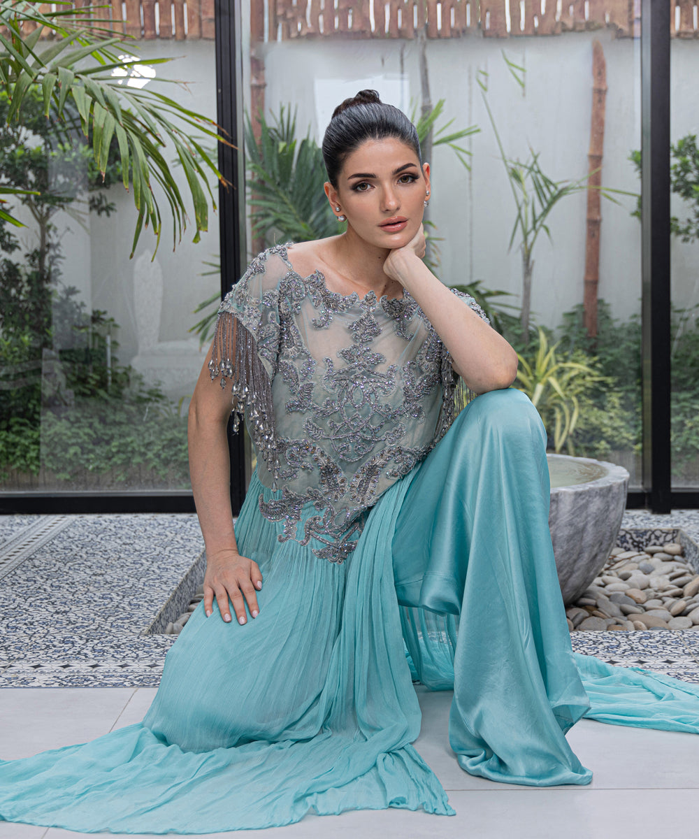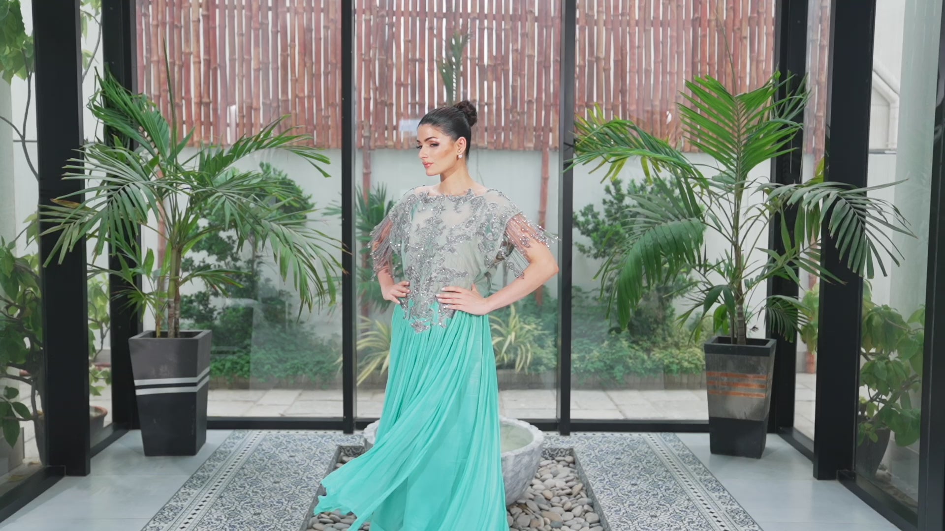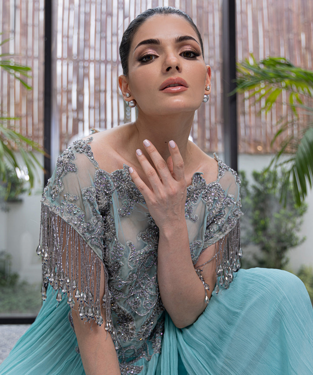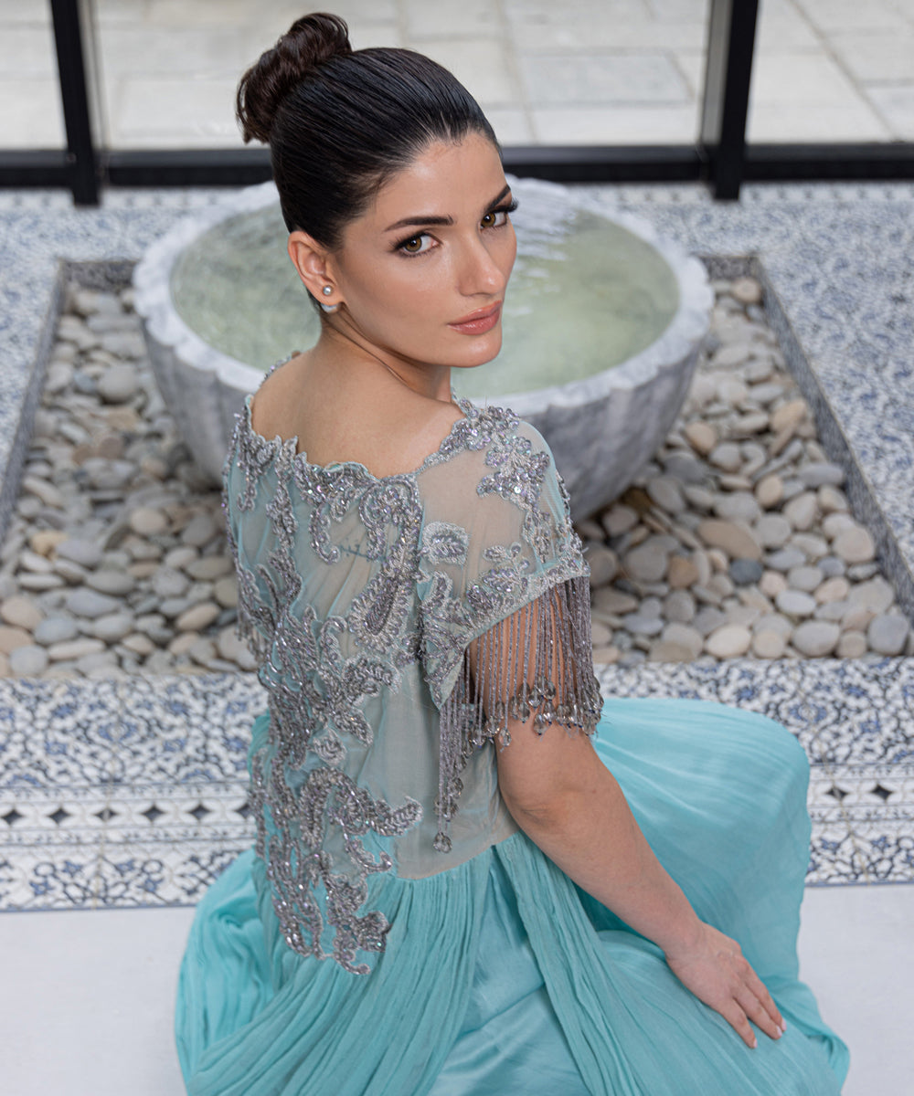 Experience the allure of timeless elegance with this flowing aqua marine crushed gown. Designed to captivate, its soft drapes add graceful movement and a fluidity that enhances every step you take.