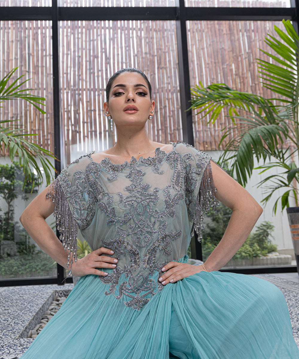 The sleeves are adorned with enchanting cut bead tassels, offering a delightful play of texture that captures light and movement, adding a dynamic flair to the outfit.